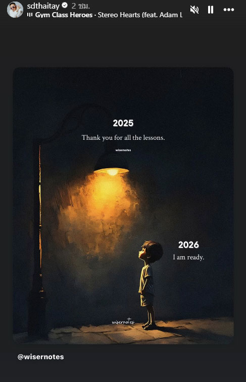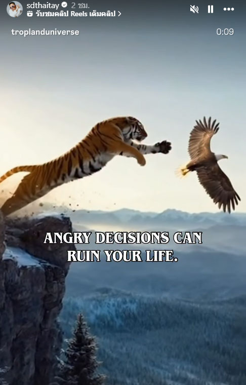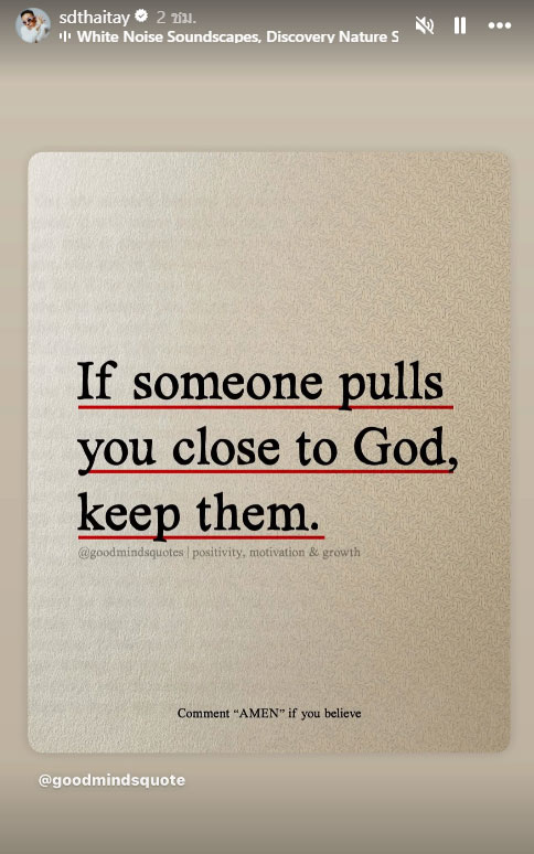 โดย เดย์ ได้อัพเดตสตอรี่บนอินสตาแกรม ซึ่งเป็นคำคมแบบรัวๆ โดยภาพแรกเป็นภาพนก พร้อมข้อความแปลได้ว่า “ตั้งใจใหม่ / ปรับใหม่” และต่อมาเป็นข้อความที่ระบุว่า “ถ้ามีใครทำให้คุณเข้าใกล้พระเจ้ามากขึ้น จงเก็บเขาไว้ในชีวิต” และอีกข้อความหนึ่งว่า “การตัดสินใจตอนโกรธสามารถทำลายชีวิตคุณได้”