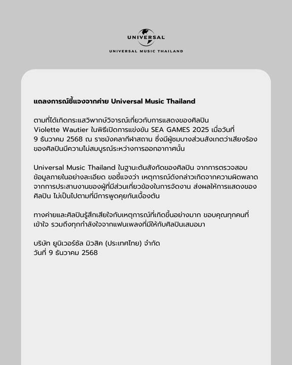 ขณะที่ค่าย Universal Music Thailand ต้นสังกัดของ วี ออกแถลงการณ์ชี้แจง ระบุว่า ตามที่ได้เกิดกระแสวิพากษ์วิจารณ์เกี่ยวกับการแสดงของศิลปิน Violette Wautier ในพิธีเปิดการแข่งขัน SEA GAMES 2025 เมื่อวันที่ 9 ธันวาคม 2568 ณ ราชมังคลากีฬาสถาน ซึ่งมีผู้ชมบางส่วนสังเกตว่าเสียงร้องของศิลปินมีความไม่สมบูรณ์ระหว่างการออกอากาศนั้น