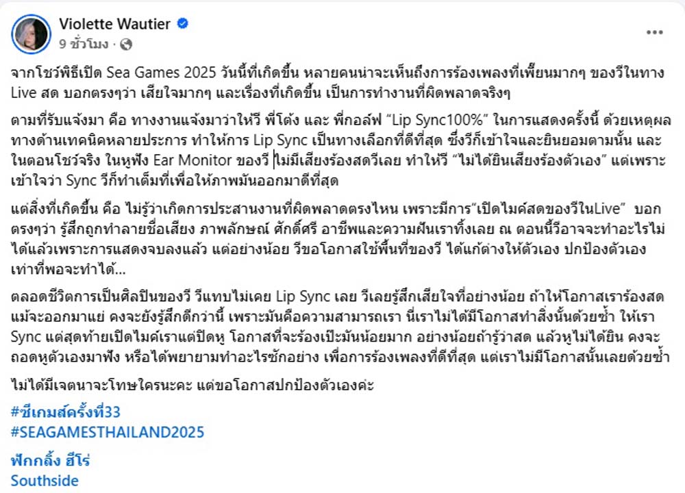 10 ธันวาคม 2568 วี วิโอเลต วอเทียร์ นักร้องสาว ออกมาชี้แจงผ่านเฟซบุ๊ก Violette Wautier กรณีการขึ้นร้องเพลงในพิธีเปิดการแข่งขันกีฬาซีเกมส์ ครั้งที่ 33 ที่ประเทศไทยเป็นเจ้าภาพ ที่สนามราชมังคลากีฬาสถาน ซึ่งเกิดข้อผิดพลาดทางเสียงในส่วนของการไลฟ์สตรีม ทำให้เสียงร้องของ วี เหมือนคนร้องเพลงเพี้ยน โดย วี ระบุว่า...
