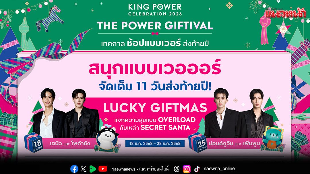คิง เพาเวอร์ ต้อนรับเทศกาลแห่งความสุข ชวน 2 คู่สุดฮอตและลูก ๆ ร่วมกิจกรรม LUCKY GIFTMAS ในงาน “KING POWER CELEBRATION 2026 THE POWER GIFTIVAL เทศกาล ช้อปแบบเวอร์ ส่งท้ายปี” วันที่ 18 ธันวาคม 2568 พบกับ เต ตะวัน-นิว ฐิติภูมิและโพก้าซัง วันที่ 25 ธันวาคม 2568 พบกับปอนด์ ณราวิชญ์ – ภูวินทร์ และเพิ่มพูน มอบสิทธิพิเศษเฉพาะสมาชิก POWER PASS ช้อปสินค้าครบทุก ๆ 500 บาท (เฉพาะวันที่ 18 และ 25 ธันวาคม 2568) รับ 1 สิทธิ์ ร่วมสนุกเป็น 1 ใน 50 ผู้โชคดี ร่วมกิจกรรมสุดเอกซ์คลูซิฟกับศิลปินคนโปรด ที่ คิง เพาเวอร์ รางน้ำสำหรับผู้โชคดีลำดับที่ 1-10 ท่านแรก รับสิทธิ์ถ่ายรูปแบบใกล้ชิดกับศิลปินพร้อมรับ SPECIAL GIFT จากศิลปิน และ GIFTIVAL BOX จาก คิง เพาเวอร์ (จำกัด 1 สิทธิ์/ท่าน) ผู้โชคดีลำดับที่ 11-25 รับสิทธิ์ถ่ายภาพโพลารอยด์ พร้อมลายเซ็นจากศิลปิน และรับ GIFTIVAL BOX จาก คิง เพาเวอร์ (จำกัด 1 สิทธิ์/ท่าน) และผู้โชคดีลำดับที่ 26-50 รับสิทธิ์ถ่ายภาพกลุ่มกับศิลปิน และรับ GIFTIVAL BOX จาก คิง เพาเวอร์ (จำกัด 1 สิทธิ์/ท่าน)งานนี้รับรองความฟินทุกโมเมนต์ส่งท้ายปี ติดตามรายละเอียดและข้อมูลเพิ่มเติมได้ Facebook: KING POWER