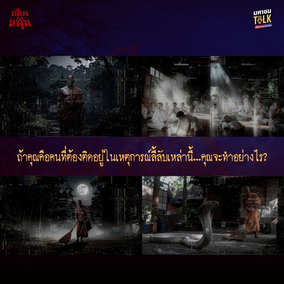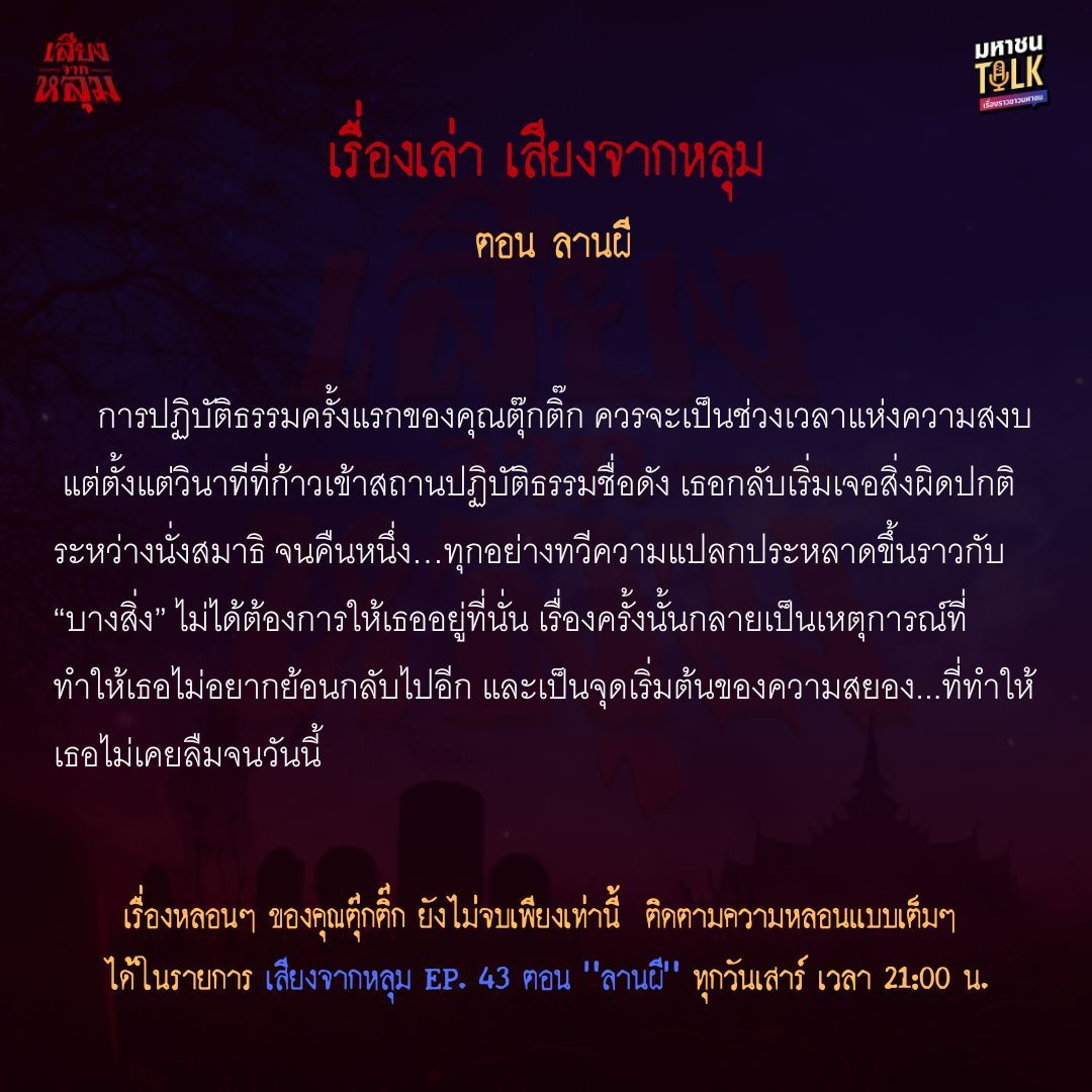 เรื่องราวเริ่มต้นจากความตั้งใจดีที่อยากหาความสงบ แต่ทันทีที่ก้าวเข้าสู่สถานปฏิบัติธรรมชื่อดัง กลับมีความผิดปกติเกิดขึ้นตั้งแต่ช่วงนั่งสมาธิ ทั้งเสียง ทั้งความรู้สึกบางอย่างที่ยากจะอธิบาย ก่อนที่เหตุการณ์ประหลาดจะทวีคูณรุนแรงขึ้นจนกลายเป็นคืนสยองที่ฝังใจไม่รู้ลืมคืนแรกที่เข้าพักยังไม่ทันหลับ ไฟในห้องมืดสนิท แต่ตุ๊กติ๊กกลับสัมผัสได้อย่างชัดเจนว่า “มีคนยืนอยู่รอบที่นอน” ความรู้สึกเหมือนถูกมองจากทุกทิศทางทำให้เธอต้องลืมตาขึ้นอย่างไม่ตั้งใจ ก่อนจะพบเงาร่างคล้ายมนุษย์หลายร่างยืนเรียงรายอยู่ด้านนอก! เหตุการณ์สุดสยองที่ไม่เคยเล่าให้ใครฟังมาก่อน จะถูกเปิดเผยแบบเต็ม ๆ ในตอน “ลานผี”ติดตามเรื่องเล่าสุดสะพรึงเต็ม ๆ ได้ในรายการ เสียงจากหลุม ตอน “ลานผี” ในวันเสาร์ที่ 13 ธันวาคมนี้ เวลา 21.00 น. เป็นต้นไป ทาง YouTube Ch7HD : https://bit.ly/ytsiangchaklum ทาง Facebook Ch7HD : https://bit.ly/siangchaklumfb ทางเว็บไซต์ BUGABOO.TV : https://bit.ly/siangchaklumonline ส่วนใครที่มีเรื่องราวสยองขวัญที่อยากมาแชร์ สามารถแอดไลน์มาเล่าได้ที่ @mahachontalk พบกับรายการพอดแคสต์ “เสียงจากหลุม” โปรเจ็กต์ มหาชนTalk อัปเดตอีพีใหม่ ทุกวันเสาร์ เวลา 21.00 น. ทาง YouTube, Facebook : Ch7HD และเว็บไซต์ BUGABOO.TV และติดตามข่าวสารความเคลื่อนไหรายการต่าง ๆ ได้ทางช่อง 7HD ดูทีวีกด 35 สดออนไลน์ BUGABOO.TV และช่องทางออนไลน์ Ch7HD (Facebook, IG, X, YouTube) และ Ch7HD Entertainment (Facebook, IG) และเว็บไซต์ www.ch7.com
