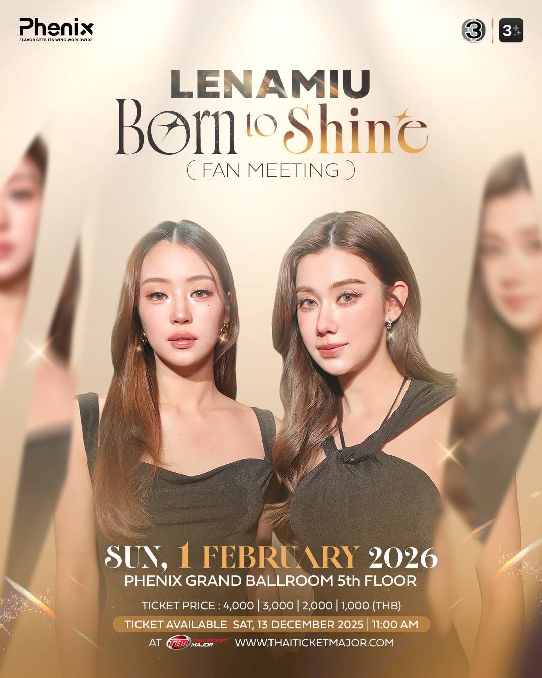 วอร์มนิ้วเตรียมกดบัตรมาใกล้ชิดกับ “ลีน่า - หมิว” แบบเอ็กซ์คลูซีฟ ที่เต็มไปด้วยเซอร์ไพรส์และโมเมนต์พิเศษที่จะทำให้คุณได้ฟินไม่รู้ลืมกับงาน “LENAMIU Born To Shine FAN MEETING” สามารถติดตามรายละเอียดเพิ่มเติมและอัปเดตทุกความเคลื่อนไหวทางโซเชียลได้ที่ Ch3Thailand และ 3 Plus