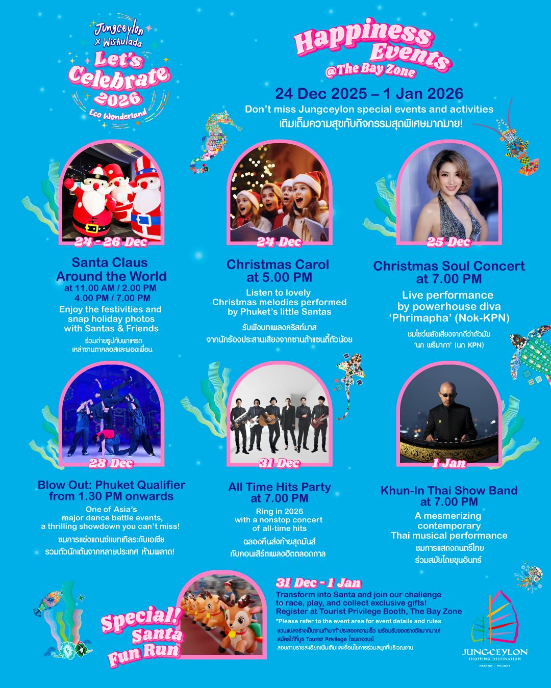 นอกจากนั้น ศูนย์การค้าจังซีลอน จับมือ ร้านค้าต่างๆ ภายในศูนย์การค้า พร้อมใจกัน “ขยายเวลาเปิดให้บริการ” แก่นักช้อป นักท่องเที่ยว ให้ได้ใช้ช่วงเวลาแห่งความสุขนี้อย่างเต็มที่มากขึ้น โดยจะเริ่มเปิดให้บริการตั้งแต่เวลา 11.00 – 23.00 น. ตั้งแต่วันนี้ ถึงวันที่ 1 ม.ค. 69 โดยสามารถติดตามรายละเอียดได้ที่ https://www.facebook.com/JungceylonFanpage หรือสอบถามข้อมูลเพิ่มเติมที่โทร. 076-600-111