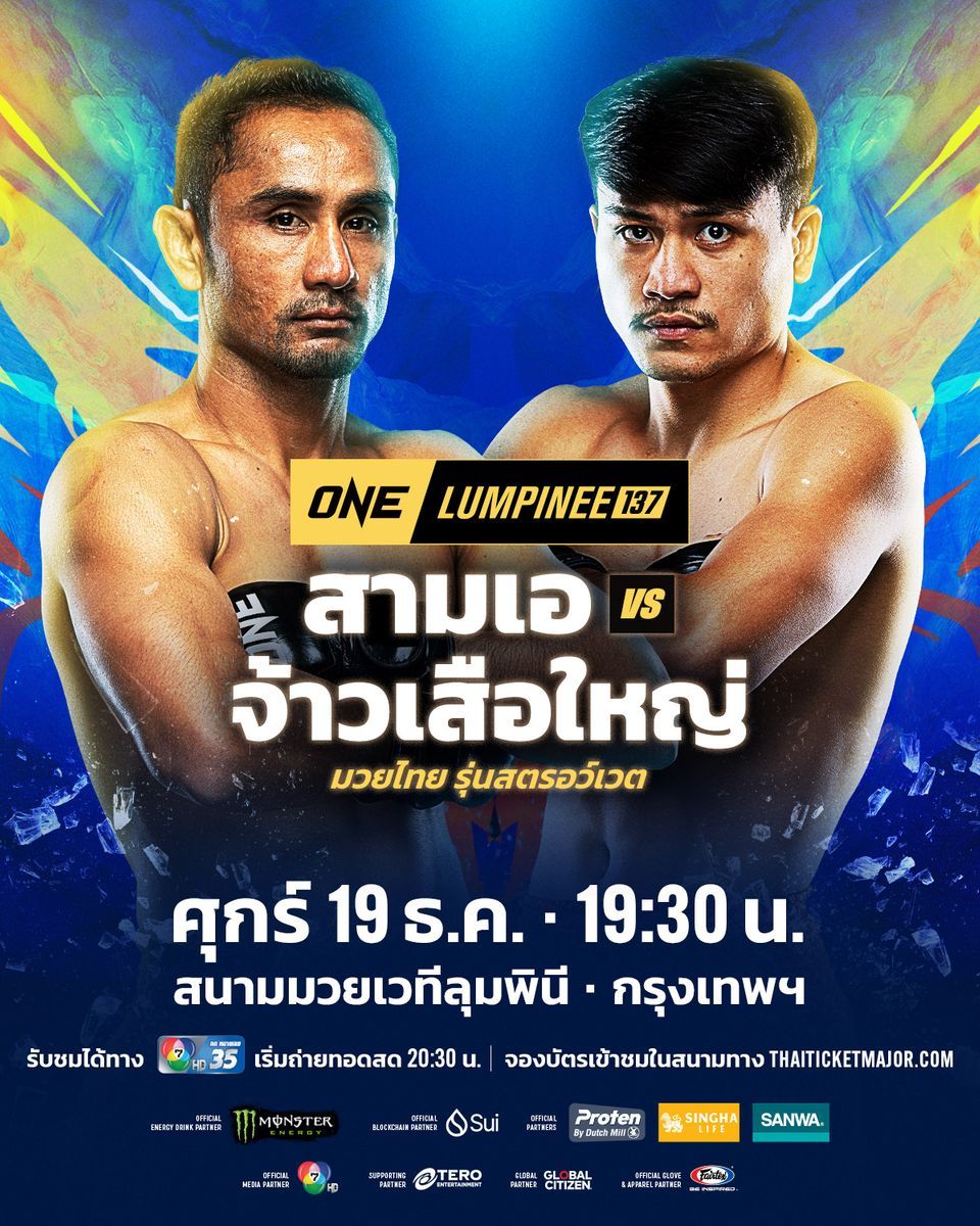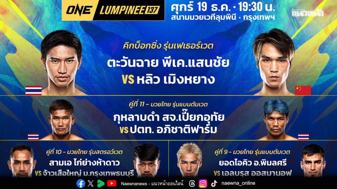 มันทุกคู่ ! ช่อง 7HD คัดเน้น ๆ ส่งทัพนักสู้ขึ้นสังเวียนเดือด เริ่มด้วย วันศุกร์ที่ 19 ธันวาคมนี้ พบกับศึก ONE ลุมพินี 137 นำโดย คู่เอกของรายการ ตะวันฉาย พีเค.แสนชัย แชมป์โลก ONE มวยไทย รุ่นเฟเธอร์เวต จากชลบุรี หวนคืนสังเวียนพบกับ หลิว เมิงหยาง นักชกฝีมือดีจากจีน ในกติกาคิกบ็อกซิ่ง รุ่นเฟเธอร์เวต ด้านคู่รอง “ซ้ายอุกกาบาต” กุหลาบดำ สจ.เปี๊ยกอุทัย วัดแกร่ง ปตท. อภิชาติฟาร์ม ในกติกามวยไทย รุ่นแบนตัมเวต ส่วน สามเอ ไก่ย่างห้าดาว อาสารับน้อง จ้าวเสือใหญ่ม.กรุงเทพธนบุรี ที่ลดลงมาชกในกติกามวยไทย รุ่นสตรอว์เวต เป็นครั้งแรกในรายการ ขณะที่คู่เอกภาคอินเตอร์จาง เป่ยเหมียน อดีตผู้ท้าชิงบัลลังก์จากจีน ปะทะ ทองพูน พีเค.แสนชัย ขาลุยจากมหาสารคาม ที่ขอเปิดประสบการณ์ใหม่ ข้ามสายชกกติกาคิกบ็อกซิ่ง รุ่นสตรอว์เวต ร่วมด้วยคู่มวยมันอีกมากมาย