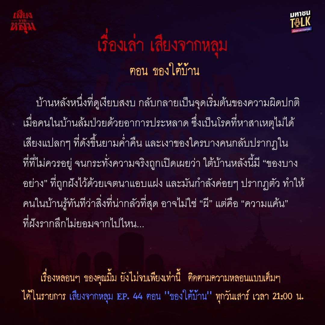 EP นี้ ชอน-ชวิศการ วรโรจน์โยธิน พิธีกรประจำรายการพอดแคสต์ เสียงจากหลุม จากโปรเจกต์ “มหาชนTalk” จะพาไปดื่มด่ำกับเรื่องเล่าจากแขกรับเชิญสุดพิเศษ พร้อมความสเปเชียลกับภาพประกอบที่ถ่ายทอดด้วย AI ที่ขยายสิ่งลี้ลับให้ออกมาชัดเจนและสั่นประสาท จนคุณรู้สึกหลอนราวกับยืนอยู่กลางเหตุการณ์นั้นจริง ๆเริ่มจาก “ความผิดปกติของคนในบ้าน” จากอาการป่วยธรรมดา กลับกลายเป็นเรื่องลึกลับที่แม้แต่คนมีวิชา ยังต้องขนหัวลุก…นี่คือเหตุการณ์จริงจากประสบการณ์ของ คุณมิ้ม-เมวรินทร์ เพชรรัตน์โภคิน นักเล่าเรื่องผีมืออาชีพเจ้าของฉายา “อ.มิ้ม เลขศาสตร์” กับเรื่องราวที่มีชื่อว่า “ของใต้บ้าน”บ้านหลังหนึ่งที่ดูเงียบสงบ กลับกลายเป็นจุดเริ่มต้นของความผิดปกติ เมื่อคนในบ้านล้มป่วยด้วยอาการประหลาด ซึ่งเป็นโรคที่หาสาเหตุไม่ได้ เสียงแปลก ๆ ที่ดังขึ้นยามค่ำคืน และเงาของใครบางคนกลับปรากฎในที่ที่ไม่ควรอยู่ จนกระทั่งความจริงถูกเปิดเผยว่าใต้บ้านหลังนี้มี “ของบางอย่าง” ที่ถูกฝังไว้ด้วยเจตนาแอบแฝงและมันกำลังค่อย ๆ ปรากฎตัว ทำให้คนในบ้านรู้ทันทีว่าสิ่งที่น่ากลัวที่สุด อาจไม่ใช่ “ผี” แต่คือ “ความแค้น” ที่ฝังรากลึกไม่ยอมจากไปของทุกชิ้น…มีเจตนา บางชิ้นถูกสร้างจากศรัทธา บางชิ้นถูกหล่อหลอมจากความแค้น และไม่ว่าจะผ่านไปนานแค่ไหน…มักจะ “กลับไปหาคนที่สร้าง” เสมอติดตามเรื่องเล่าสุดสะพรึงเต็ม ๆ ได้ในรายการ เสียงจากหลุม ตอน “ของใต้บ้าน” ในวันเสาร์ที่ 20 ธันวาคมนี้ เวลา 21.00 น. เป็นต้นไป ทาง YouTube Ch7HD : https://bit.ly/ytsiangchaklum ทาง Facebook Ch7HD : https://bit.ly/siangchaklumfb ทางเว็บไซต์ BUGABOO.TV : https://bit.ly/siangchaklumonline ส่วนใครที่มีเรื่องราวสยองขวัญที่อยากมาแชร์ สามารถแอดไลน์มาเล่าได้ที่ @mahachontalk พบกับรายการพอดแคสต์ “เสียงจากหลุม” โปรเจ็กต์ มหาชนTalk อัปเดตอีพีใหม่ ทุกวันเสาร์ เวลา 21.00 น. ทาง YouTube, Facebook : Ch7HD และเว็บไซต์ BUGABOO.TV และติดตามข่าวสารความเคลื่อนไหวรายการต่าง ๆ ได้ทางช่อง 7HD ดูทีวีกด 35 สดออนไลน์ BUGABOO.TV และช่องทางออนไลน์ Ch7HD (Facebook, IG, X, YouTube) และ Ch7HD Entertainment (Facebook, IG) และเว็บไซต์ www.ch7.com