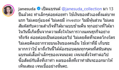 “เปิดแบรนด์ @janesuda_collection มา 13 ปีแล้วคะ ทำเล็กๆ ค่อยค่อยทำ ใช้เงินของตัวเองตั้งแต่บาทแรก ไม่เคยกู้แบงค์ ไม่เคยมี investor ไม่มีหุ้นส่วน ไม่เคยสัมผัสกับความสำเร็จที่ได้มาแบบข้ามคืน ทุกอย่างที่ได้มาในวันนี้เกิดขึ้นจากความตั้งใจในการวางแผนธุรกิจอย่างจริงจัง ค่อยค่อยเป็นค่อยค่อยไป ไม่เคยคิดที่จะคดโกงใคร ไม่เคยคิดอยากรวยบนเงินของคนอื่น ใช้เท่าที่มี เก็บซะมากกว่าใช้