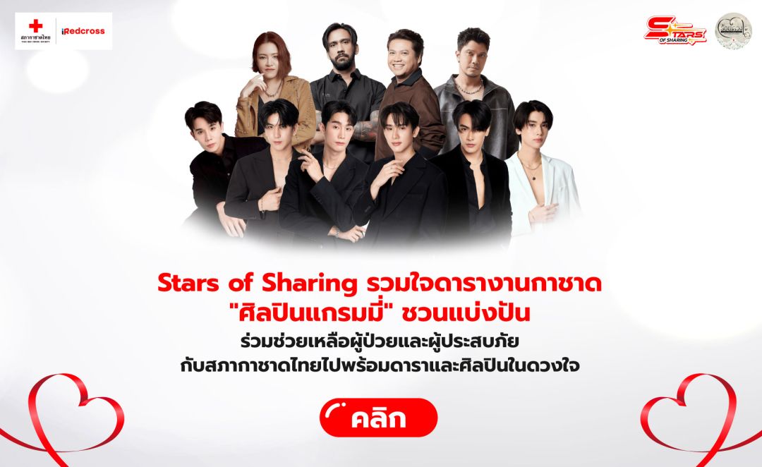อิ่มบุญออนไลน์ไปกับศิลปินคนโปรด ในโครงการ “Stars of Sharing รวมใจดารางานกาชาด 2568” กิจกรรมพิเศษภายในงานกาชาดประจำปี 2568 ผ่านแพลตฟอร์ม iRedcross ที่พัฒนาโดย Donation HUB สภากาชาดไทย ผนึกกำลังศิลปินจากจีเอ็มเอ็ม มิวสิค ได้แก่ เจ๋ง Big Ass, พลพล, หนุ่ม ณพสิน และ แพท วง Klear พร้อมด้วยนักแสดงขวัญใจแฟนๆ จาก GMMTV ได้แก่ ฟอส จิรัชพงศ์, บุ๊ค กษิดิ์เดช, จุง อาเชน, ดัง ณัฎฐ์ฐชัย, จิมมี่ จิตรพล และ ซี ทวินันท์ แท็กทีมเชิญชวนแฟนคลับและประชาชนทั่วไป ร่วมสมทบทุนเพื่อขับเคลื่อนภารกิจ ด้านมนุษยธรรมของสภากาชาดไทย อาทิ การช่วยเหลือผู้ป่วย ผู้เปราะบาง ผู้ด้อยโอกาส ผู้ประสบภัย เด็กและเยาวชน ให้ได้รับการดูแล ฟื้นฟู และมีคุณภาพชีวิตที่ดีขึ้นอย่างยั่งยืน
