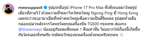 โดยมิวได้โพสต์ภาพผ่านอินสตาแกรมส่วนตัว เล่ารายละเอียดเหตุการณ์ว่า "รูปแรกคือรูป iPhone 17 Pro Max ที่เพิ่งถอยมาใหม่รูปเดียวที่ถ่ายไว้ ด้วยความที่จะมาไหว้พระใหญ่ Ngong Ping ที่ Hong Kong เลยกะว่าจะเอามาเปิดที่หน้าพระใหญ่เพื่อความเป็นศิริมงคล