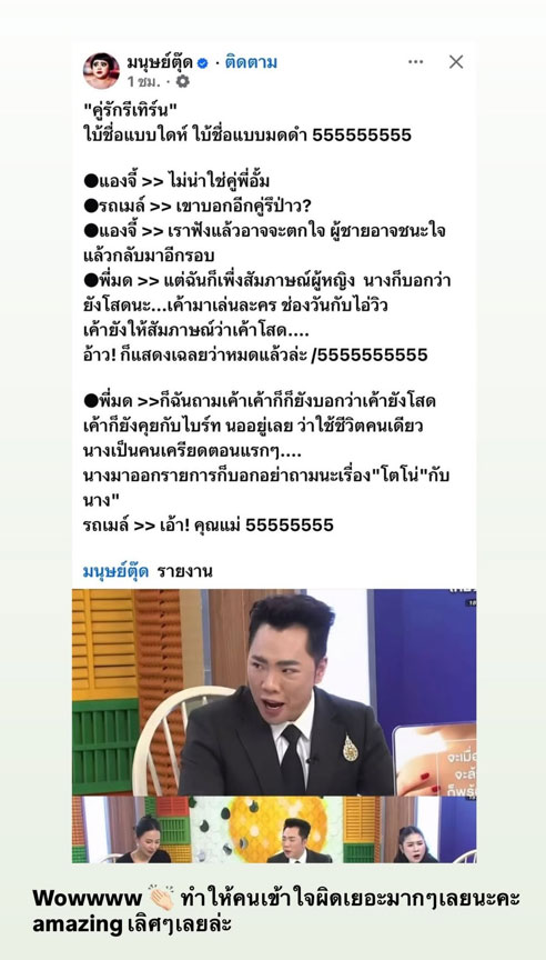 ล่าสุด ประเด็นดังกล่าวถูกหยิบยกมาพูดถึงในรายการ ข่าวใส่ไข่ โดยมีพิธีกร มดดำ คชาภา, รถเมล์, มิ้นท์ และ แองจี้ ร่วมเมาท์ข่าวร้อน ซึ่งในช่วงหนึ่ง มดดำได้หลุดคำใบ้แบบชัดเจน จนพิธีกรร่วมถึงกับแซวว่า “แม่เฉลยอีกแล้ว” ทำให้กระแสยิ่งแรงขึ้นไปอีก ขณะเดียวกัน เพจดังในโลกออนไลน์ก็ได้นำประเด็นนี้ไปขยายต่อ จนเกิดการโยงชื่อดาราหลายคน