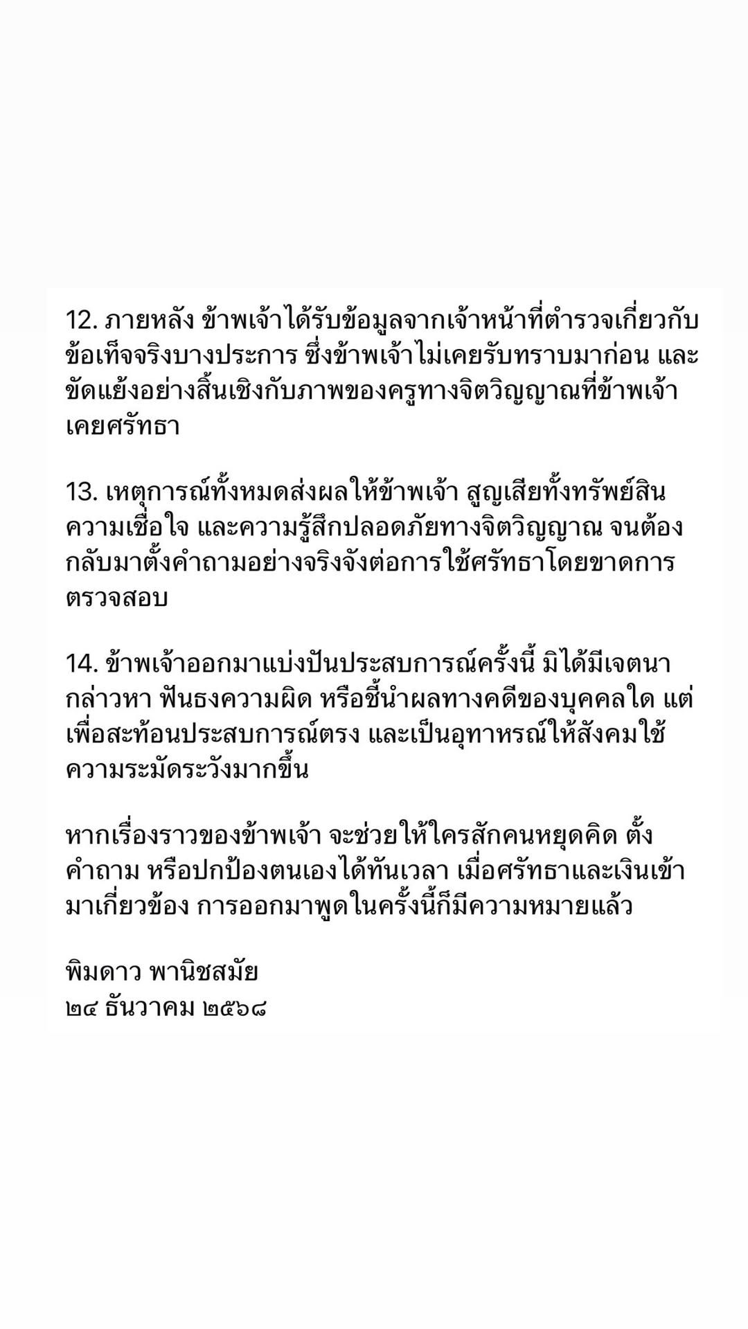 14. ข้าพเจ้าออกมาแบ่งปันประสบการณ์ครั้งนี้ มิได้มีเจตนากล่าวหา ฟันธงความผิด หรือชี้นำผลทางคดีของบุคคลใด แต่เพื่อสะท้อนประสบการณ์ตรง และเป็นอุทาหรณ์ให้สังคมใช้ความระมัดระวังมากขึ้น