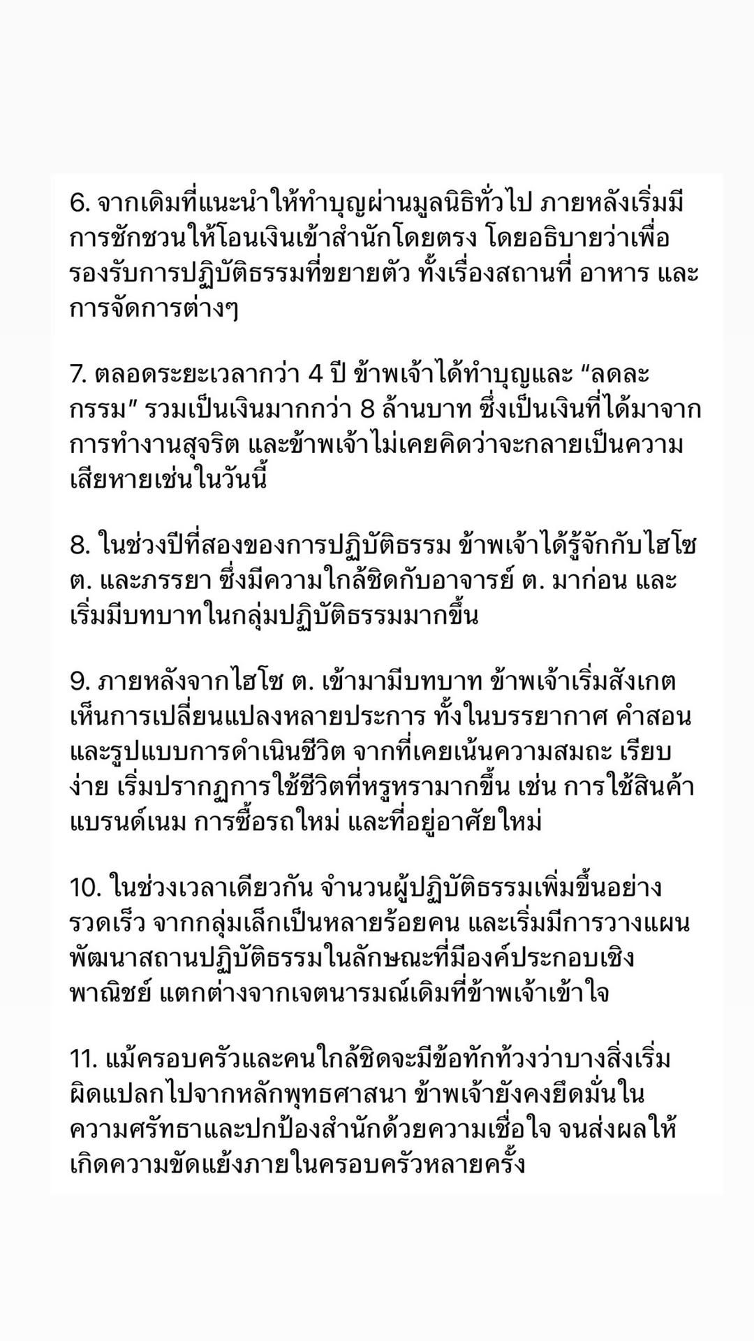 7. ตลอดระยะเวลากว่า 4 ปี ข้าพเจ้าได้ทำบุญและ “ลดละกรรม” รวมเป็นเงินมากกว่า 8 ล้านบาท ซึ่งเป็นเงินที่ได้มาจากการทำงานสุจริต และข้าพเจ้าไม่เคยคิดว่าจะกลายเป็นความเสียหายเช่นในวันนี้