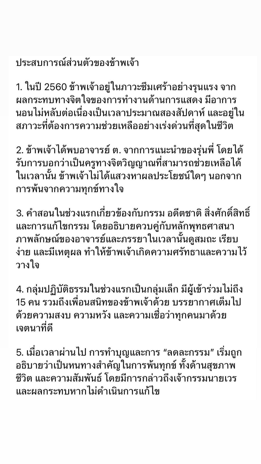 2. ข้าพเจ้าได้พบ อาจารย์ ต. จากการแนะนำของรุ่นพี่ โดยได้รับการบอกว่าเป็นครูทางจิตวิญญาณที่สามารถช่วยเหลือได้ ในเวลานั้น ข้าพเจ้าไม่ได้แสวงหาผลประโยชน์ใดๆ นอกจากการพ้นจากความทุกข์ทางใจ
