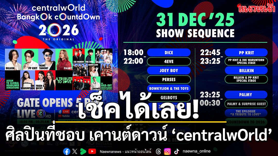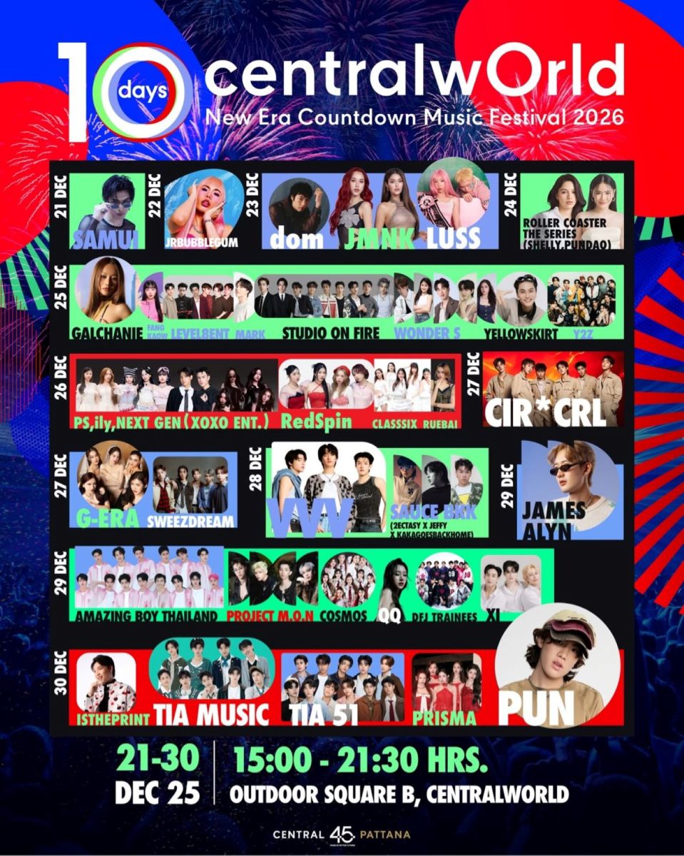 แล้วมาใจเต้นแรงข้ามปีพร้อมกันในวันที่ 31 ธ.ค. centralwOrld Bangkok Countdown 2026 The Original – A Tribute To Love พบศิลปิน T-Pop ระดับ Headliner กับฟรีคอนเสิร์ตระดับ World-class ที่ขับเคลื่อนด้วยฝีมือคนไทย 100% และเกิดขึ้นจากพลังความร่วมมือของ การท่องเที่ยวแห่งประเทศไทย และ กรุงเทพมหานคร พันธมิตรภาครัฐและเอกชน เพื่อสร้างโมเมนต์ฉลองศักราชใหม่ที่ผู้คนทั้งประเทศจะมานับถอยหลังพร้อมกับ พีพี กฤษฏ์, บิวกิ้น พุฒิพงศ์, ปาล์มมี่, นนท์ ธนนท์, อิงค์ วรันธร, ฟรีน-เบคกี้ และศิลปินดังระดับ Sold-out ทุกโชว์มากที่สุดในไทย อย่าง ซีพฤกษ์, นุนิว, PERSES, DICE, GELBOYS, 4EVE, โบกี้ไลออน, THE TOYS, โจอี้ บอย ที่ขนเพลง Exclusive Song List และ Special Show รวมศิลปินที่จะเกิดขึ้นที่เซ็นทรัลเวิลด์เท่านั้น บนเวทีดิจิทัลรูปแบบใหม่ด้วยเทคโนโลยีดิจิทัลที่ผสานภาพ เสียง และเอฟเฟกต์แบบ Immersive เข้าด้วยกันแบบไร้รอยต่อ