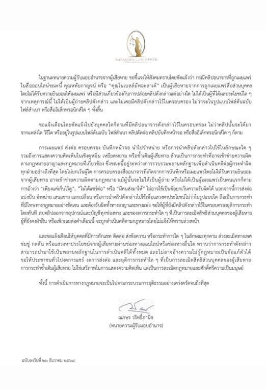 การเผยแพร่ ส่งต่อ ครอบครอง บันทึกหน้าจอ นำไปจำหน่าย หรือการนำคลิปดังกล่าวไปใช้ในลักษณะใด ๆ รวมถึงการแสดงความคิดเห็นในเชิงดูหมิ่น เหยียดหยาม หรือซ้ำเติมผู้เสียหาย ล้วนเป็นการกระทำที่อาจเข้าข่ายความผิดตามกฎหมายอาญาและกฎหมายที่เกี่ยวข้อง ซึ่งขณะนี้อยู่ระหว่างการรวบรวมพยานหลักฐานเพื่อดำเนินคดีต่อผู้กระทำผิดทุกฝ่ายอย่างถึงที่สุด โดยไม่ยกเว้นผู้ใด การครอบครองสื่ออนาจารที่เกิดจากการบันทึกหรือเผยแพร่โดยไม่ได้รับความยินยอมจากผู้เสียหาย อาจเข้าข่ายความผิดตามกฎหมาย แม้ผู้นั้นจะไม่ได้เป็นผู้ถ่าย หรือไม่ได้เป็นผู้เผยแพร่เป็นคนแรกก็ตาม การอ้างว่า "เพียงแค่เก็บไว้ดู", "ไม่ได้แชร์ต่อ" หรือ "มีคนส่งมาให้" ไม่อาจใช้เป็นข้อยกเว้นความรับผิดได้ นอกจากนี้การส่งต่อ แบ่งปัน จำหน่าย เสนอขาย แลกเปลี่ยน หรือการนำคลิปดังกล่าวไปใช้เพื่อแสวงหาประโยชน์ไม่ว่าในรูปแบบใด ถือเป็นการกระทำที่มีโทษทางกฎหมายอย่างชัดเจน และต้องรับผิดทั้งทางอาญาและทางแพ่ง ขอให้ผู้ที่ยังมีคลิปดังกล่าวไว้ในครอบครองยุติการกระทำโดยทันที ลบคลิปออกจากอุปกรณ์และบัญชีทุกช่องทาง และของดการกระทำใด ๆ ที่เป็นการละเมิดสิทธิส่วนบุคคลของผู้เสียหาย ผู้ที่ยังคงฝ่าฝืน หรือเพิกเฉยต่อคำเตือนนี้ จะถูกดำเนินคดีตามกฎหมายโดยไม่แจ้งให้ทราบล่วงหน้า