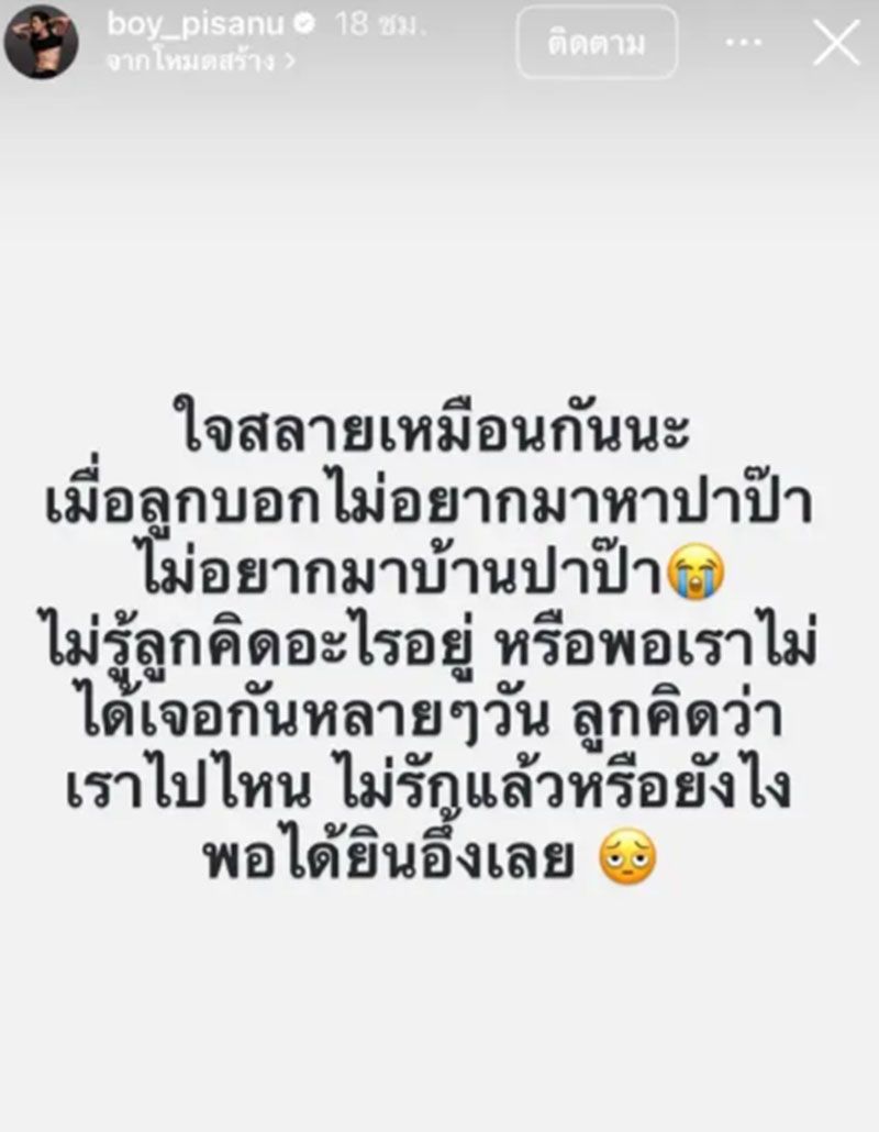 ล่าสุด 'บอย ภิษณุ' ได้ออกมาโพสต์คำถามจุกอกจากลูกสาว 'น้องเฟรย่า' ผ่านทางอินสตาแกรมส่วนตัว "@boy_pisanu" ระบุข้อความว่า ใจสลายเหมือนกันนะ เมื่อลูกบอกไม่อยากมาหาปาป๊า ไม่อยากมาบ้านปาป๊า ไม่รู้ลูกคิดอะไรอยู่ หรือพอเราไม่ได้เจอกันหลายๆ วัน ลูกคิดว่าเราไปไหน ไม่รักแล้วหรือยังไง พอได้ยินอึ้งเลย