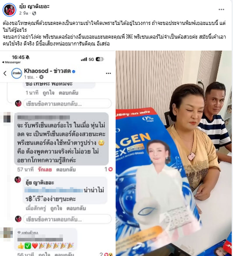 หลังจากนั้นก็มีชาวเน็ตรายหนึ่งคอมเมนต์แรงว่า "จะรับพรีเซ็นเตอร์อะไร ในเมื่อหุ่นไม่ลด จะเป็นพรีเซนเตอร์ต้องสวยนะคะ พรีเซ็นเตอร์ต้องใช้หน้าตารูปร่าง คือต้องพูดความจริงค่ะไม่อวย ไม่อยากโกหกความรู้สึกค่ะ"