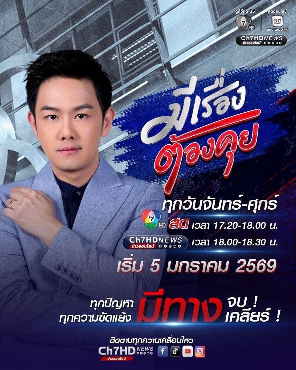 “ขอบคุณโอกาสครั้งสำคัญที่มอบหมายด้วยความไว้วางใจ ที่มีให้ผมเสมอมาครับ และในครั้งนี้ก็เช่นกันเตรียมความพร้อมและตั้งใจเต็มที่ครับ ฝากชวนติดตามชมและให้กำลังใจพวกเราชาว “มีเรื่องต้องคุย” และทีมข่าว 7HD ทุกคนนะครับ พวกเราพร้อมเจาะลึกทุกแง่มุมอย่างชัดเจนให้ทุกคนได้ติดตาม ร่วมหาความจริง หาทางออกที่ชัดเจน กับปมที่สังคมคาใจ อย่าพลาดชมนะครับ”ห้ามพลาด! รายการ “มีเรื่องต้องคุย” ทุกปัญหามีทางจบ ทุกความขัดแย้งมีทางเคลียร์ ติดตามชมได้ทุกวันจันทร์ – ศุกร์ ตั้งแต่เวลา 17.20-18.00 น. ทางช่อง 7HD และตามต่อช่องทางออนไลน์ Ch7HD News เวลา 18.00-18.30 น. สามารถติดตามข่าวสารความเคลื่อนไหว เลือกตั้ง 69 ได้ทาง ช่อง 7HD ดูทีวีกด 35 สดออนไลน์ BUGABOO.TV และช่องทางออนไลน์ Ch7HD NEWS (Facebook, IG, Tiktok) Ch7HD (Facebook, IG, TikTok, X และ YouTube) และ เว็บไซต์ www.ch7.com