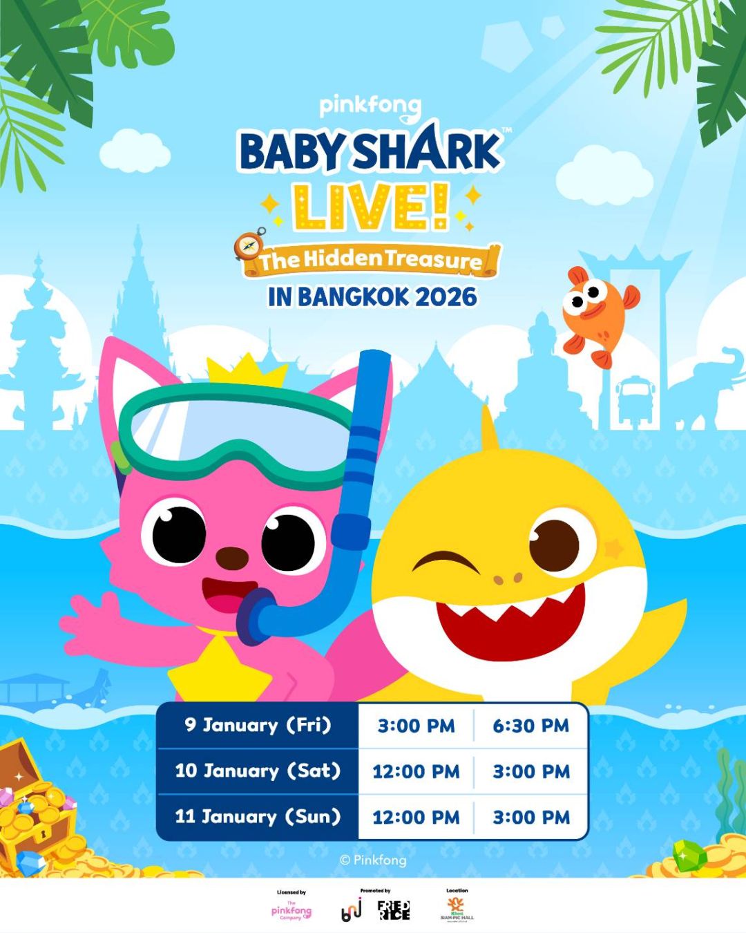 โดยการแสดงครั้งนี้มีการปรับรอบการแสดง ผังที่นั่ง และเบเนฟิต เพื่อให้ผู้ชมได้ร่วมสนุกมากขึ้น “BABY SHARK LIVE in BANGKOK 2026” จัดขึ้นระหว่างวันที่ 9 – 11 มกราคม 2569 (ทั้งหมด 6 รอบการแสดง) ณ เคแบงก์สยามพิฆฮอลล์ สำหรับผู้ที่ซื้อ VIP PACKAGE รับสิทธิ์ถ่ายรูปกับ Pinkfong & Baby Shark, สติกเกอร์ครบรอบ 10ปี พร้อมโฟโต้การ์ดเวอร์ชั่นพิเศษ และมินิสติกเกอร์น่ารักๆ กลับบ้านไปยิ้มต่อได้อีกยาว ซื้อบัตรได้แล้ววันนี้ ทางเว็บไซต์และเคาน์เตอร์ ไทยทิคเก็ตเมเจอร์ทุกสาขา ???? https://bit.ly/babysharkbkk26
