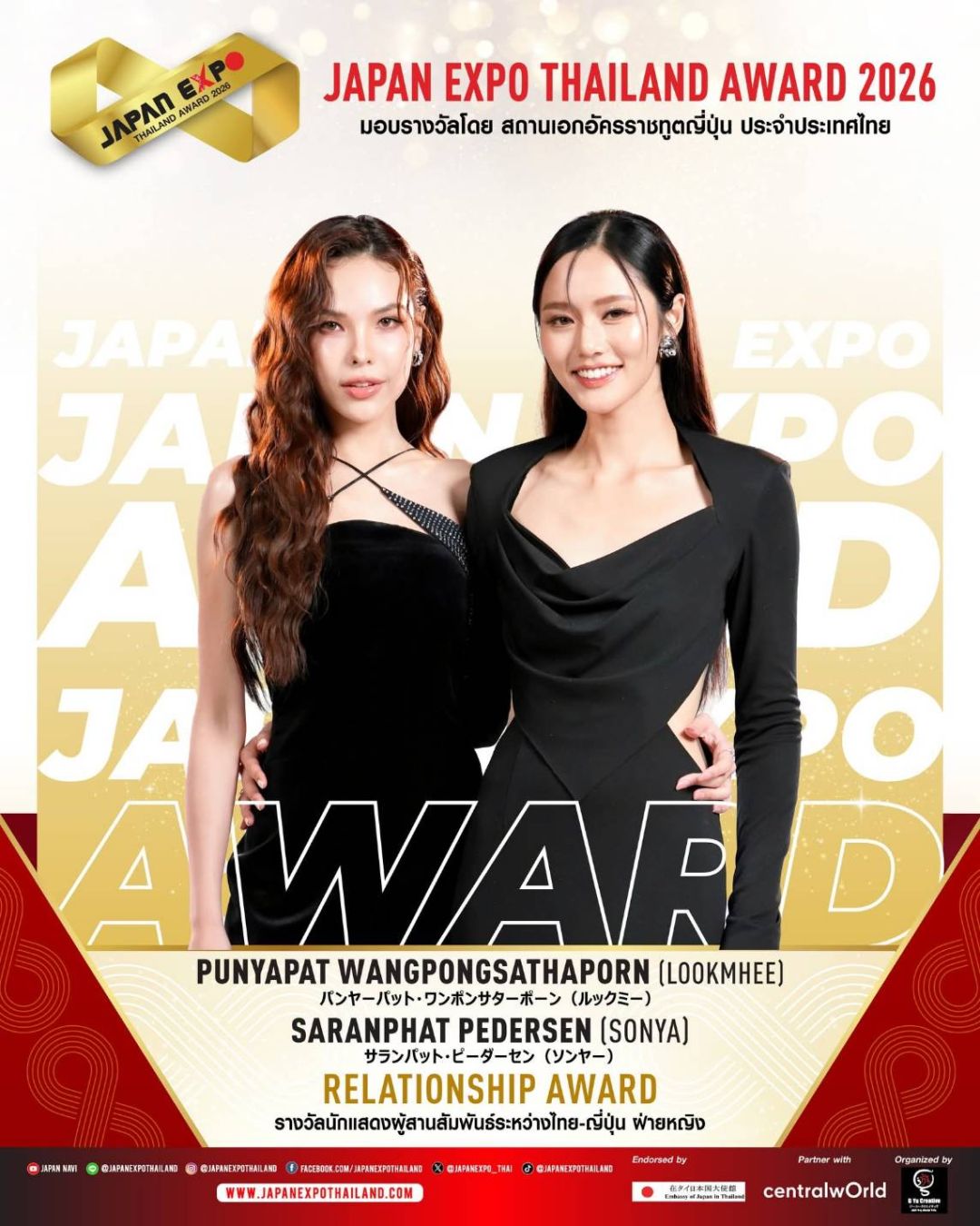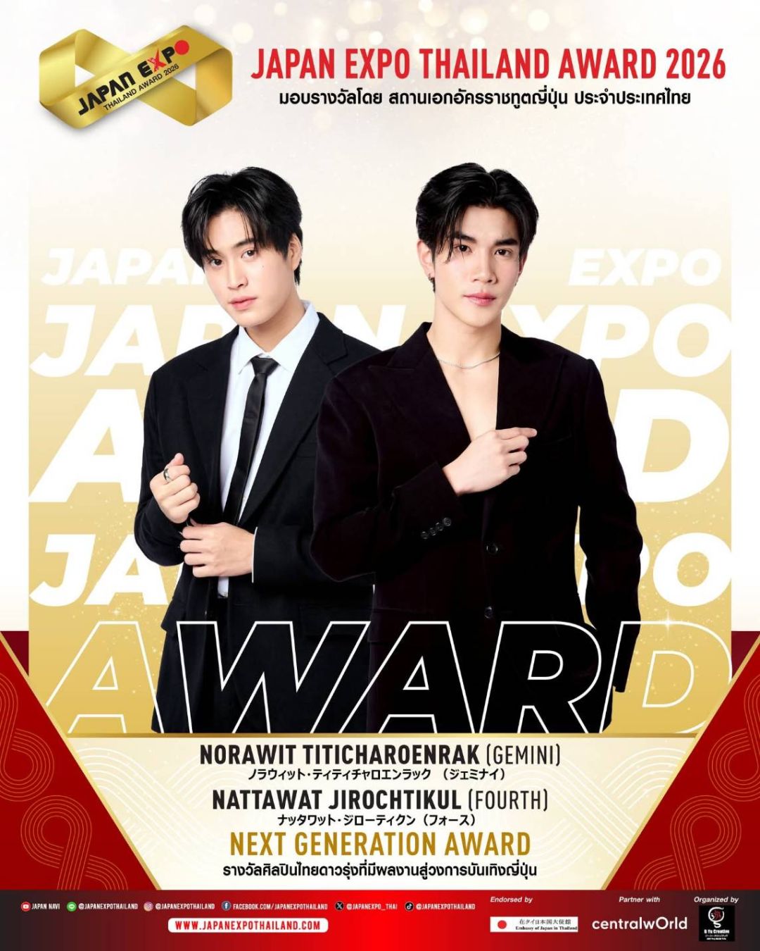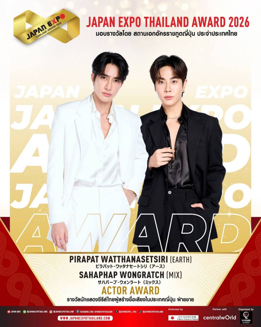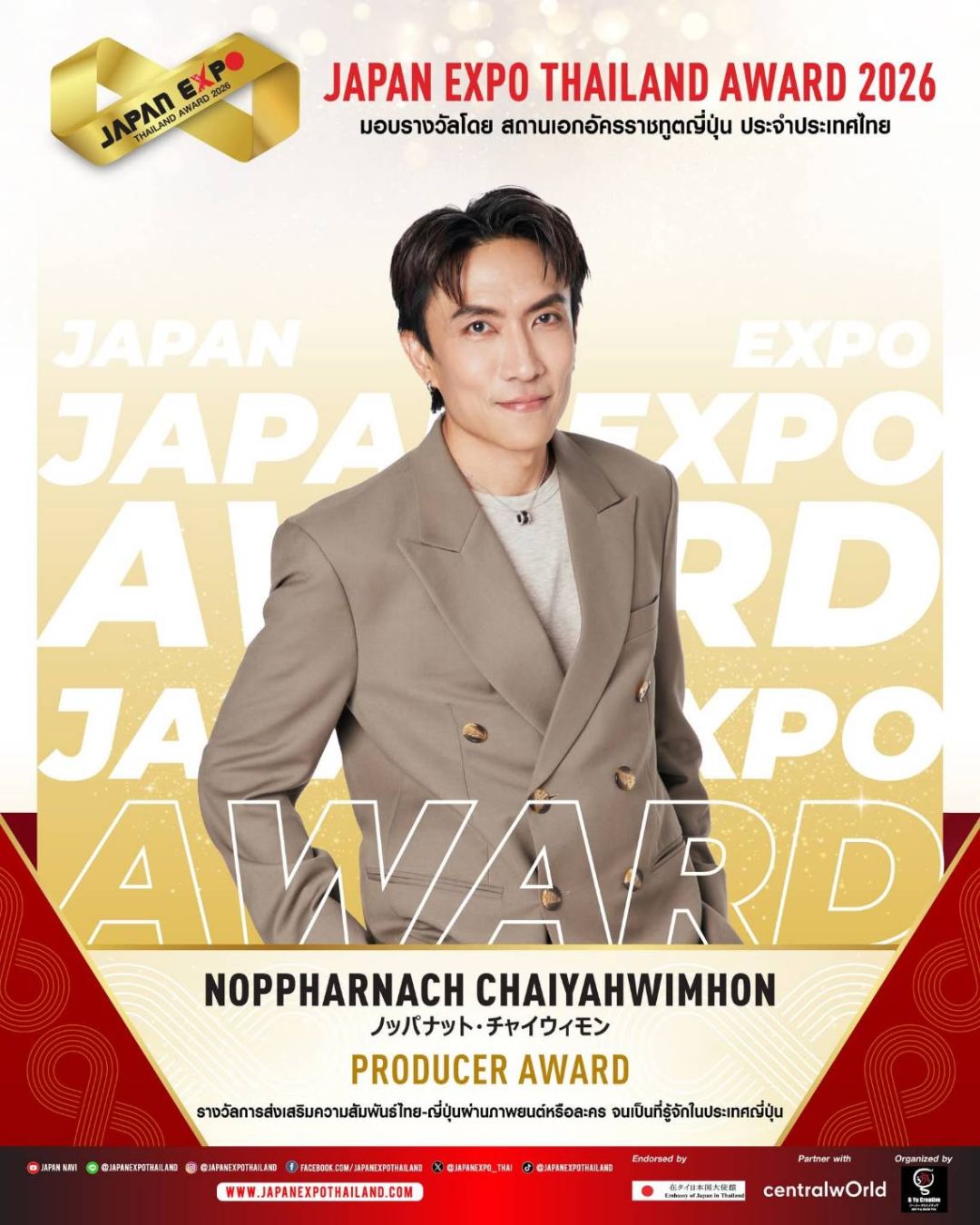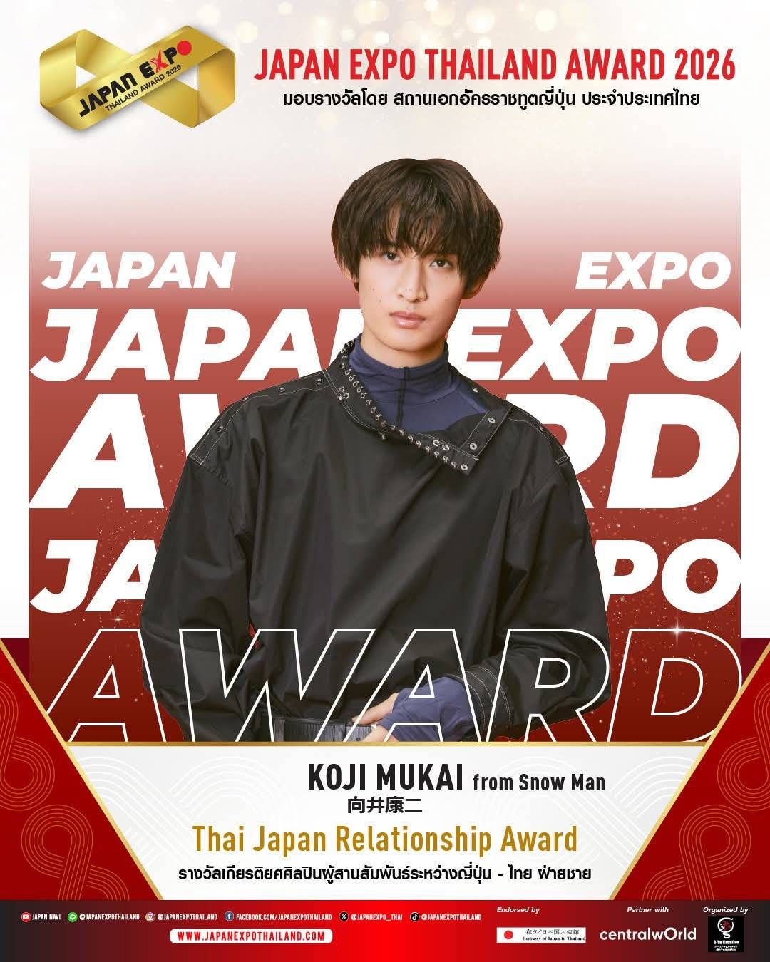 JAPAN EXPO THAILAND 2026 ครั้งที่ 11 ในธีม “Japan Thai United as One – ญี่ปุ่นไทยรวมใจเป็นหนึ่งเดียว” เราจะสื่อรวมเป็นน้ำหนึ่งใจเดียวกันระหว่างไทยกับญี่ปุ่นที่สานสัมพันธ์กันมาอย่างยาวนาน และตลอดไปนอกจากจะครบเครื่องเรื่องญี่ปุ่นแล้ว JAPAN EXPO THAILAND 2026 ครั้งที่ 11 ยังเฉลิมฉลองด้วยการจัดงานมอบรางวัลสุดยิ่งใหญ่แห่งปี JAPAN EXPO AWARDS2026 หนึ่งเดียวในประเทศไทย!!! ที่ได้การตอบรับอย่างสูงสุดจากคนบันเทิง และผู้อยู่เบื้องหลังความสำเร็จ รวมถึงการสานความสัมพันธ์อันดีระหว่างประเทศไทยและประเทศญี่ปุ่นขอแสดงความยินดีกับ KOJI MUKAI (โคจิ มุไก) From Snow Man ได้รับรางวัลเกียรติยศ JAPAN EXPO THAILAND AWARD2026 ในสาขา THAI JAPAN RELATIONSHIP AWARD รางวัลเกียรติยศศิลปินผู้สานสัมพันธ์ระหว่างญี่ปุ่น-ไทย และขอแสดงความยินดีกับศิลปิน นักแสดง และบุคคลในวงการบันเทิงไทยที่ได้รับรางวัล JAPAN EXPO AWARDS2026 ที่ได้รับการพิจารณาจากคณะกรรมการผู้ทรงคุณวุฒิทั้งในประเทศไทยและประเทศญี่ปุ่น มอบรางวัลโดย สถานเอกอัครราชทูตญี่ปุ่น สำหรับบุคคลในแวดวงบันเทิงที่ส่งเสริมความสัมพันธ์ระหว่างไทยกับญี่ปุ่น โดยในปีนี้มีผู้ได้รับรางวัลต่างๆ ดังนี้