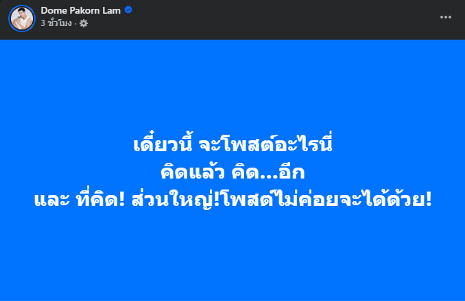 ล่าสุด โดมได้ออกมาเคลื่อนไหวอีกครั้ง ผ่านเพจเฟซบุ๊ก Dome Pakorn Lam โดยโพสต์ระบุว่า “เดี๋ยวนี้ จะโพสต์อะไรนี่ คิดแล้ว คิด…อีก และ ที่คิด! ส่วนใหญ่!โพสต์ไม่ค่อยจะได้ด้วย!”