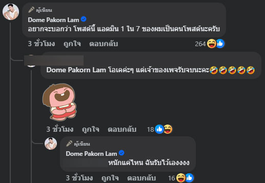 นอกจากนี้ เจ้าตัวยังได้คอมเมนต์เพิ่มเติมว่า “อยากจะบอกว่า โพสต์นี้ แอดมิน 1 ใน 7 ของผมเป็นคนโพสต์นะครับ” และแฟนคลับเข้าแซวต่อว่า “โอเคค่ะๆ แต่เจ้าของเพจรับจบนะคะ” ซึ่งโดมก็ไม่รอช้า เข้ามาตอบกลับว่า “หนักแค่ไหน ฉันรับไว้เองงงง”