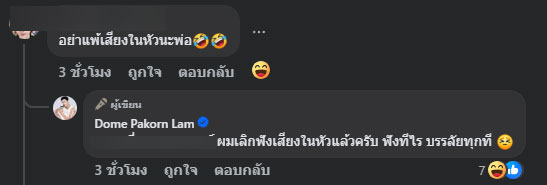 ด้านแฟนคลับอีกคนหนึ่ง ก็ได้เข้ามาคอมเมนต์ว่า “อย่าแพ้เสียงในหัวนะพ่อ” เจ้าตัวก็ได้เข้ามาตอบกลับว่า “ผมเลิกฟังเสียงในหัวแล้วครับ ฟังทีไร บรรลัยทุกที”