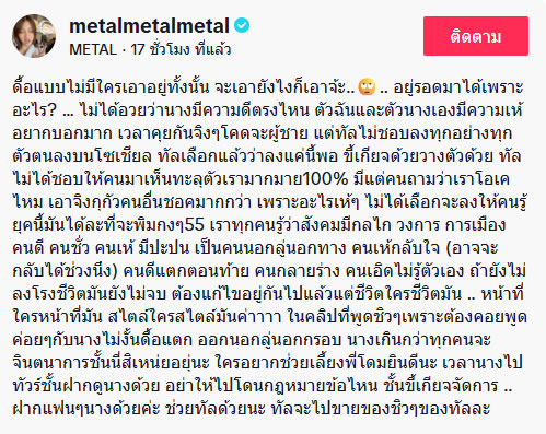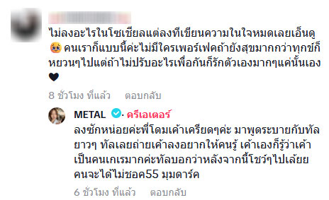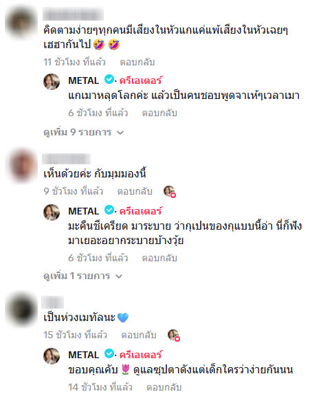 ขณะที่ในคอมเมนต์ก็มีแฟนๆ เข้ามาให้กำลังใจ เมทัล กันยกใหญ่ ซึ่ง เมทัล ก็ได้ขอบคุณพร้อมตอบกลับแฟน ๆ ด้วยว่า "ขอบคุณครับ ดูแลซุปตาร์ดังแต่เด็กใครว่าง่ายกันนน" และ "เมื่อคืนชีเครียดความเป็นดาราของชี มาระบายค่ะ ว่ากูเป็นของกูแบบนี้อ่า นี่ก็ฟังมาเยอะอ ยากระบายบ้างวุ้ย"