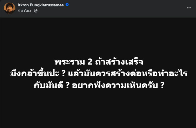 ล่าสุด นักร้องหนุ่มชื่อดัง “จ๋าย ไททศมิตร” ได้ออกมาแสดงความคิดเห็นผ่านเฟซบุ๊กส่วนตัว ตั้งคำถามระบุข้อความว่า “พระราม 2 ถ้าสร้างเสร็จ มึงกล้าขึ้นปะ ? แล้วมันควรสร้างต่อหรือทำอะไรกับมันดี ? อยากฟังความเห็นครับ ?”