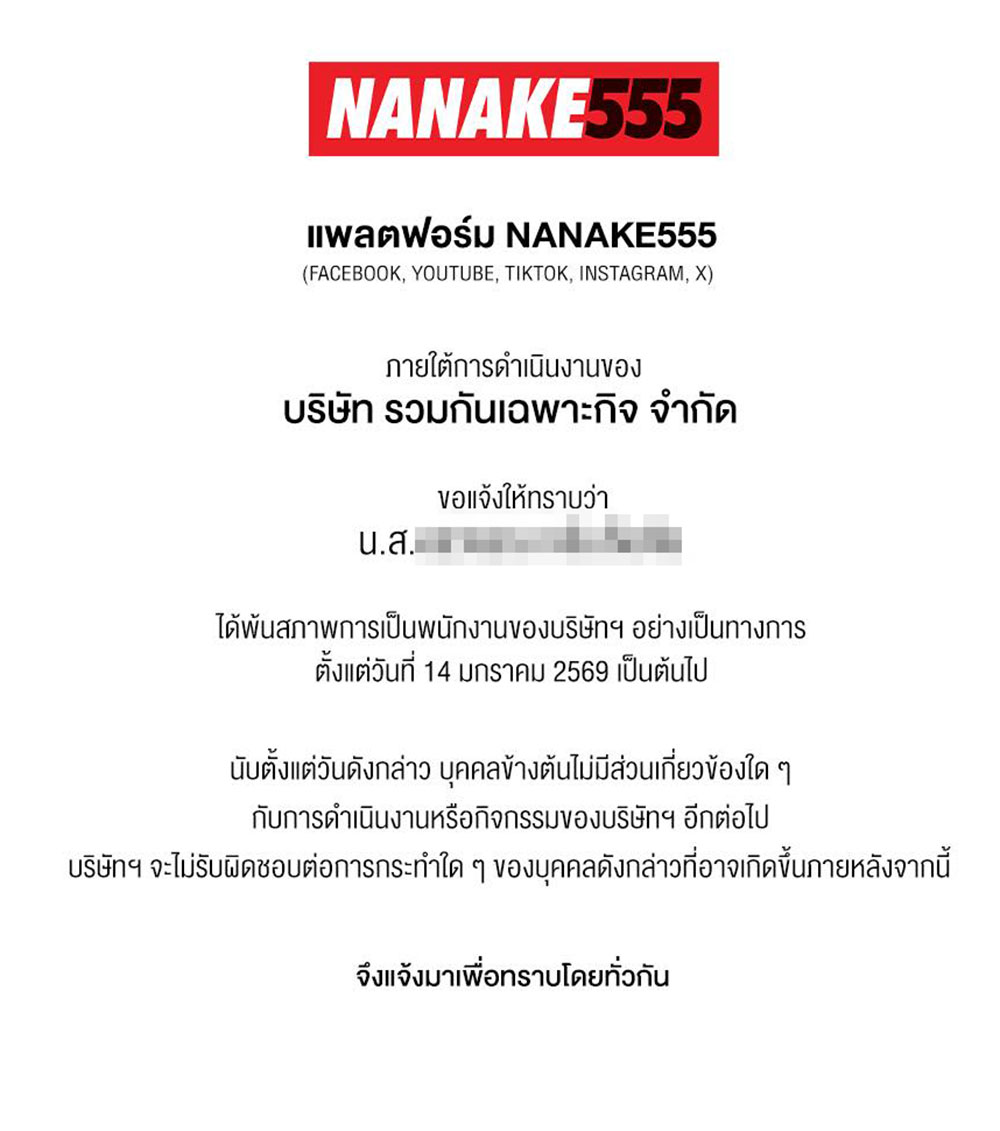พร้อมระบุข้อคววามว่า แพลตฟอร์ม nanake555 (FACEBOOK,YOUTUBE,TIKTOK,INSTAGRAM) ภายใต้การดำเนินงานของบริษัท รวมกันเฉพาะกิจ จำกัด ขอให้แจ้งให้ทราบว่า น.ส.xxx xxx ได้พ้นสภาพการเป็นพนักงานของบริษัทฯ อย่างเป็นทางการ ตั้งแต่วันที่ 14 มกราคม 2569 เป็นต้นไป