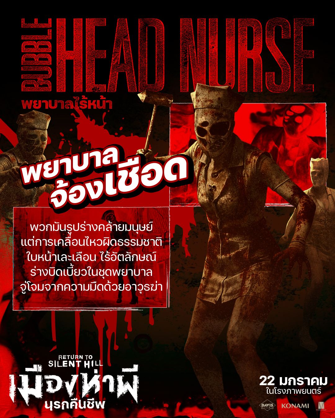 รูปลักษณ์ที่คล้ายมนุษย์ แต่การเคลื่อนไหวผิดจังหวะราวกับร่างไม่เชื่อฟังสมอง ใบหน้าเละเทะไร้อัตลักษณ์ เหลือเพียงร่างบิดเบี้ยวในชุดพยาบาล พุ่งจู่โจมเหยื่อด้วยอาวุธทุกรูปแบบจากความมืด