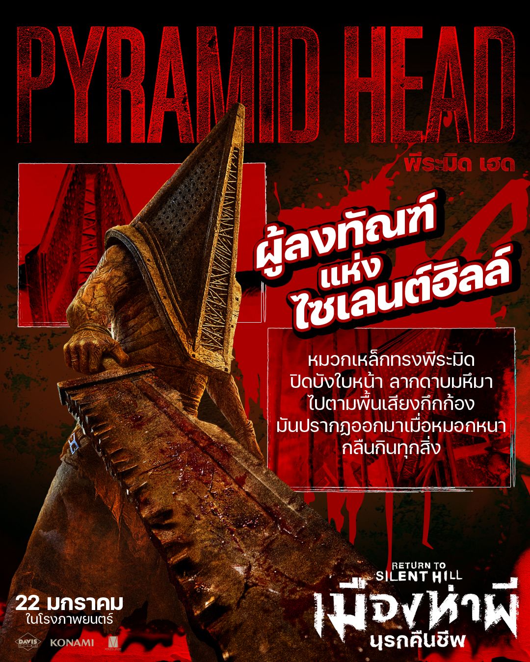 ผู้ลงทัณฑ์แห่ง “ไซเลนต์ฮิลล์” อสุรกายร่างใหญ่ยักษ์ สวมหมวกเหล็กทรงพีระมิดที่ปิดบังใบหน้าไว้ทั้งหมด ลากดาบขนาดมหึมาครูดไปตามพื้นพร้อมเสียงโลหะขูดกึกก้อง ทุกการเคลื่อนไหวเชื่องช้าแต่หนักแน่นและไม่อาจหยุดยั้ง มันปรากฏออกมาเมื่อหมอกหนากลืนกินทุกสิ่ง