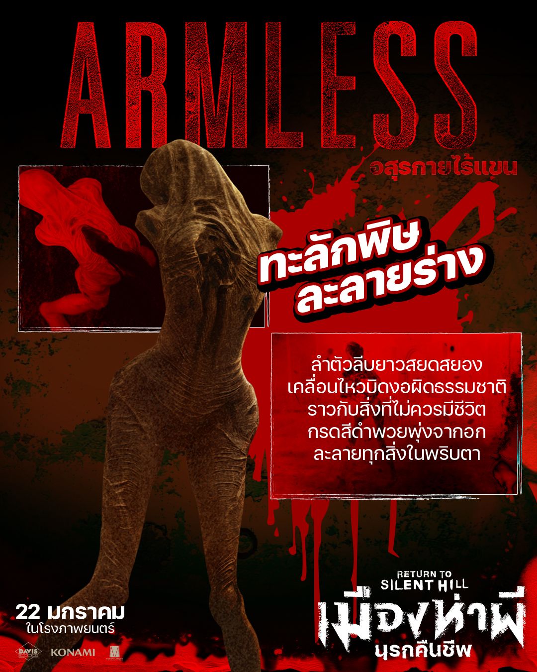อีกหนึ่งหัวใจสำคัญของภาพยนตร์ “Return to Silent Hill” คือฝูงอสุรกายในเมืองแห่งหมอก ด้วยข้อจำกัดและศักยภาพทางเทคโนโลยีในยุคของ “PlayStation 2” ทำให้ดีไซน์มอนสเตอร์หลายๆ ตัวในเกมยังไปได้ไม่สุดทาง แต่สำหรับเวอร์ชันภาพยนตร์ภาคใหม่นี้ นักออกแบบมอนสเตอร์สามารถปรับโฉมเหล่าอสุรกายให้ออกมายอดเยี่ยมยิ่งขึ้น โดยมีทีม “โคนามิ” (บริษัทผู้ผลิตเกมฯ) เข้ามาดูแลอย่างใกล้ชิดร่วมกับ “Millennium FX” จากสหราชอาณาจักรที่เคยสร้างสรรค์ผลงานโดดเด่นมากมายอย่าง “Saving Private Ryan” และ “Doctor Who” มารับหน้าที่สร้างและดูแลเอฟเฟกต์อสุรกายต่อยอดจากดีไซน์ดั้งเดิมของ “แพทริก ทาโทปูลอส”“สัตว์ประหลาดแต่ละตัวมีความท้าทายเชิงเทคนิคและความคิดสร้างสรรค์ที่ต่างออกไปยกตัวอย่าง ‘อสุรกายไร้แขน’ ที่มีความยืดหยุ่นสูง เริ่มจากการสร้างชิ้นส่วนเทียมหลายชิ้นประกอบเข้าด้วยกัน แต่ทีมงานก็เปลี่ยนแผนอย่างรวดเร็วมาใช้ชุดแบบชิ้นเดียวสวมใส่เพื่อความคล่องตัวของนักแสดง เราสร้างของพวกนี้ขึ้นมาแต่คนที่ทำให้อสุรกายมีชีวิตคือนักแสดง ที่งานของเราออกมาดูดี ต้องขอบคุณพวกเขา” กรรมการบริษัท Millenium FX “เคต วอลช์” กล่าว