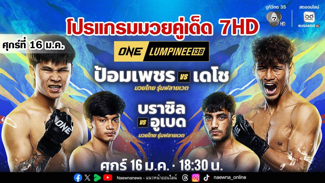 ห้ามพลาด “ช่อง 7HD” จัดหนักคัดเน้น ๆ มวยฝีมือดีจาก 2 สังเวียน วันศุกร์นี้ “ONE ลุมพินี 138” ส่งคู่เอก “ป้อมเพชร ป๋องสุพรรณ พีเค.” ท้าชน “เดโช ป.บริรักษ์” และวันอาทิตย์ลุ้นมันคู่มวยเดือดจากเวที “มวยไทย 7 สี” คู่เอก “เซียงน้อยร้อยล้าน เหล่าโชคเจริญราชสีห์” วัดแกร่งกับ “ก้องธรณี สันติอุบล”