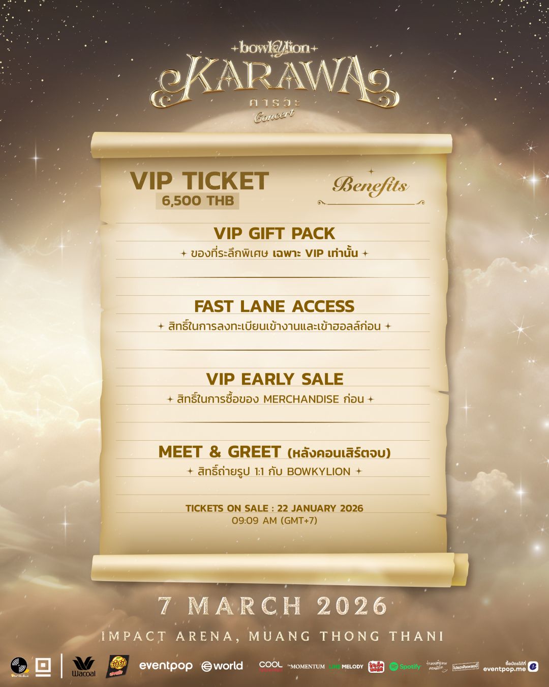 ครั้งนี้เธอกลับมาสร้างปรากฏการณ์ครั้งใหม่กับ KARAWA CONCERT คอนเสิร์ตแทนคำขอบคุณไม่รู้จบที่เธอทุ่มลงมือลงแรงทำเองทุกขั้นตอน ตั้งแต่การวางคอนเซปต์ที่นำเอาคำว่า ‘คารวะ’ มาเป็นคีย์เวิร์ดหลักเพื่อตีแผ่ถึงความเคารพต่อกัน ระหว่างผู้ฟังที่โค้งคำนับต่อผลงานของเธอ ในอีกมุมหนึ่งเธอเองก็ก้มคารวะขอบคุณแฟนเพลงตอบกลับไปเช่นกัน เป็นการโค้งมาบรรจบกันกลายเป็นรูป ‘หัวใจ’ คอนเสิร์ตนี้จึงเป็นเสมือนการหลอมรวมทั้งตัวตน จิตวิญญาณ พลังแห่งศรัทธา ที่นำพาให้เธอสร้างผลงานออกมาตลอดการเดินทางในฐานะ “BOWKYLION” และความพิเศษสำหรับคอนเสิร์ตในครั้งนี้ นอกจากจะได้หูเคลือบทองไปกับเสียงร้องอันทรงพลังแล้ว ทุกโชว์หรือแม้แต่โปสเตอร์ที่ปล่อยออกมาล้วนสอดแทรกไปด้วยสัญญะบางอย่างเป็นกิมมิกเล็ก ๆ ที่อยากชวนให้ทุกคนมาลองไขรหัสไปพร้อม ๆ กันร่วมเป็นส่วนหนึ่งกับคอนเสิร์ตเดี่ยวครั้งที่ 2 ของ “BOWKYLION” ที่จะจัดขึ้นในวันที่ 7 มีนาคม 2569 ณ อิมแพ็ค อารีน่า เมืองทองธานี รับประกันความจัดหนัก จัดเต็ม อลังการทั้งแสง สี เสียง พร้อมโชว์สุดตระการตาที่ไม่เคยเห็นที่ไหนมาก่อน ตั้งนาฬิกาปลุกรอกดบัตรพร้อมกัน วันที่ 22 ม.ค. 2569 เวลา 09.09 น. ผ่านทาง EVENTPOP หรือ https://www.eventpop.me/s/karawa-concert-2026 บัตรราคาเริ่มต้น 1,500 / 2,000 / 2,500 / 3,000 / 3,500 / 4,000 / 4,500 / 5,000 / 6,500 (VIP) สาวกแฟนเพลง BOWKYLION ไม่ควรพลาด!สามารถติดตามรายละเอียดคอนเสิร์ตเพิ่มเติมได้ที่ https://www.facebook.com/whattheduckmusicและ https://www.instagram.com/bowkylion