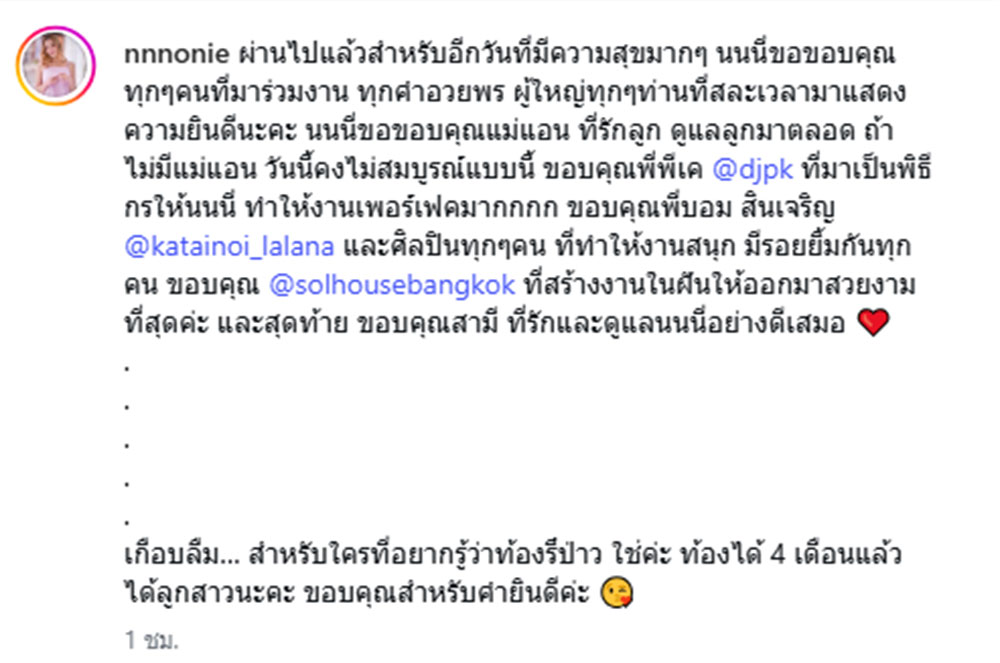 ต่อมา 'นนนี่ นนลนีย์' ได้ออกมาโพสต์ข้อความผ่านอินสตาแกรมส่วนตัว "@nnnonie" ระบุข้อความว่า "ผ่านไปแล้วสำหรับอีกวันที่มีความสุขมากๆ นนนี่ขอขอบคุณทุกๆคนที่มาร่วมงาน ทุกคำอวยพร ผู้ใหญ่ทุกๆท่านที่สละเวลามาแสดงความยินดีนะคะ นนนี่ขอขอบคุณแม่แอน ที่รักลูก ดูแลลูกมาตลอด ถ้าไม่มีแม่แอน วันนี้คงไม่สมบูรณ์แบบนี้ ขอบคุณพี่พีเค @djpk ที่มาเป็นพิธีกรให้นนนี่ ทำให้งานเพอร์เฟคมากกกก ขอบคุณพี่บอม สินเจริญ @katainoi_lalana และศิลปินทุกๆคน ที่ทำให้งานสนุก มีรอยยิ้มกันทุกคน ขอบคุณ @solhousebangkok ที่สร้างงานในฝันให้ออกมาสวยงามที่สุดค่ะ และสุดท้าย ขอบคุณสามี ที่รักและดูแลนนนี่อย่างดีเสมอ
