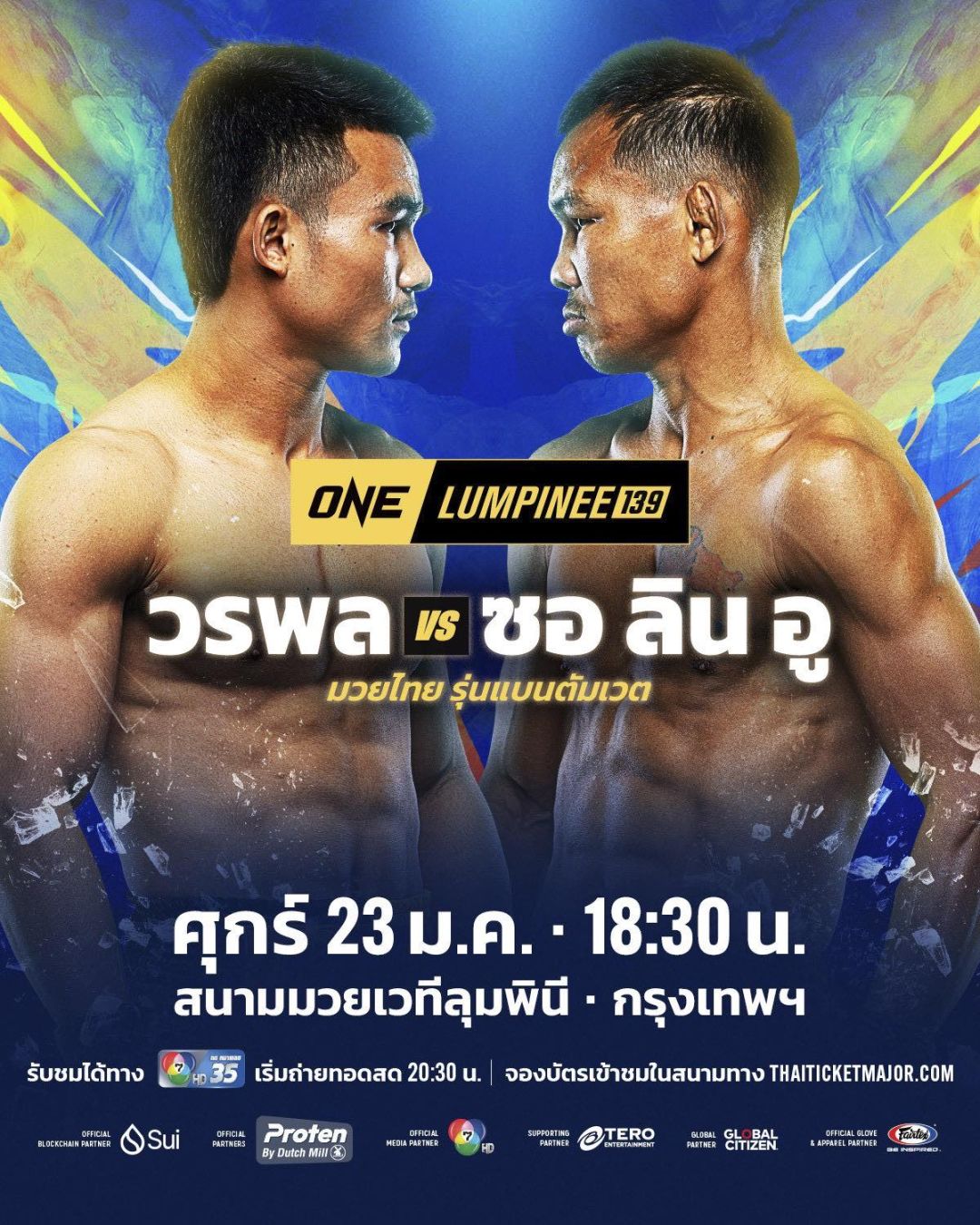 พิสูจน์ความมันทะลุจอ ช่อง 7HD ชวนลุ้นคู่มวยเดือดสุดสัปดาห์ โดย วันศุกร์ที่ 23 มกราคมนี้ รายการONE ลุมพินี 139 ส่งคู่เอกประจำรายการ วรพล ลูกเจ้าพ่อโรงต้ม มวยซ้ายใจเด็ด จากบุรีรัมย์ ตั้งเป้ากู้ฟอร์มเก่ง เตรียมวัดพลังแกร่งกับ ซอ ลิน อู จอมบู๊ขาลุย จากเมียนมา ที่หวังกลับมาแจ้งเกิดอีกครั้ง ในกติกามวยไทย รุ่นแบนตัมเวต ด้านคู่เอกภาคอินเตอร์เป็นการพิสูจน์ความร้อนแรงของสองนักชกฟอร์มสดระหว่าง ขุนพลน้อย ส.สมหมาย นักสู้จอมเก๋า จากนครศรีธรรมราช พบกับ รุสตัม ยูนูซอฟ ดาวรุ่งไร้พ่าย จากรัสเซีย ภายใต้กติกามวยไทย รุ่นฟลายเวต ร่วมด้วยคู่มวยมันอีกมากมายแฟนมวยติดตามชมถ่ายทอดสดจาก สนามมวยเวทีลุมพินี (รามอินทรา) ทางช่อง 7HD กด 35 สดออนไลน์ทาง BUGABOO.TV ตั้งแต่เวลา 20.30 น. นอกจากนี้คอกีฬาสามารถเกาะติด LIVE-Streaming ตั้งแต่เวลา 18.30 น. ทาง Facebook : Ch7HD / Ch7HD News / Ch7HD Sports และ YouTube : Ch7HD