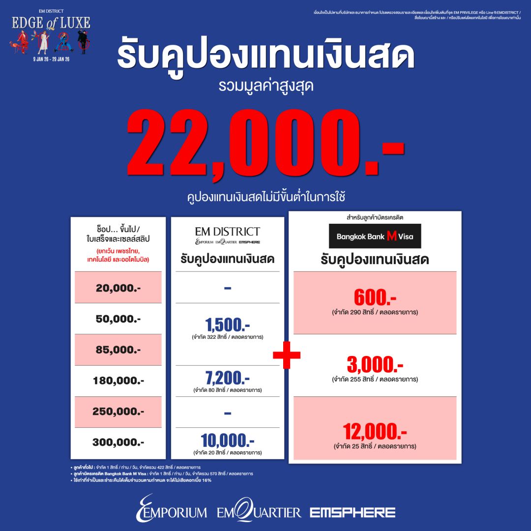 เริ่มจากความพิเศษสำหรับนักช้อปในแคมเปญ EM DISTRICT EDGE OF LUXE เมื่อช้อปปิ้งร้านค้าแฟชั่น ไลฟ์สไตล์ชั้นนำทั้ง 3 ศูนย์การค้าฯ ผ่านบัตรเครดิต Bangkok Bank M Visa ตามเงื่อนไข รับคูปองแทนเงินสดสูงสุด 22,000 บาท และลูกค้าทั่วไปเมื่อช้อปครบ 10,000 บาท