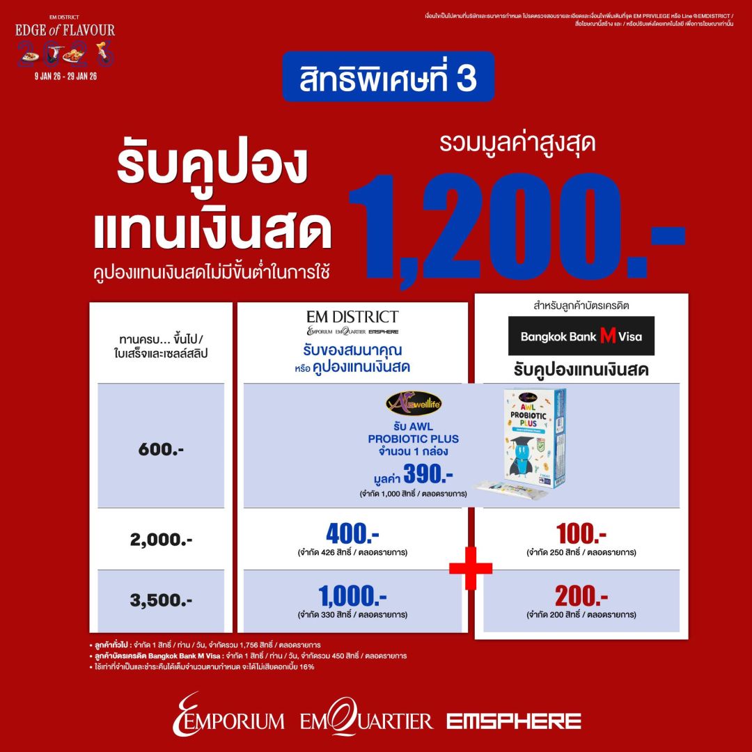 สำหรับนักช้อปสายกินพบกับโปรโมชันพิเศษ EM DISTRICT EDGE OF FLAVOUR เมื่อรับประทานอาหาร ณ ร้านอาหารชั้นนำที่ เอ็มโพเรียม เอ็มควอเทียร์ และ เอ็มสเฟียร์ ลูกค้าทั่วไป รับ AWL PROBIOTIC PLUS ตัวช่วยปรับสมดุลจุลินทรีย์ในลำไส้ จำนวน 1 กล่อง มูลค่า 390 บาท (เมื่อรับประทานอาหารครบ 600 บาทขึ้นไป) หรือรับคูปองส่วนลดแทนเงินสดเมื่อทานอาหารครบตามเงื่อนไข โดยใช้บัตรเครดิต Bangkok Bank M Visa รับความพิเศษ 3 ต่อ โดยต่อที่ 1 แลกรับคูปองส่วนลดแทนเงินสดใช้รับประทานอาหาร 100 บาท (สำหรับใช้รับประทานอาหาร 500 บาทขึ้นไป) หรือ คูปองส่วนลดแทนเงินสดใช้รับประทานอาหาร 500 บาท (สำหรับใช้รับประทานอาหาร 1,000 บาทขึ้นไป) ต่อที่ 2 รับสิทธิพิเศษหรือส่วนลดสูงสุด 50% จากร้านอาหารที่ร่วมรายการกว่า 30 ร้านค้า และต่อที่ 3 รับคูปองแทนเงินสดสูงสุด 1,200 บาท