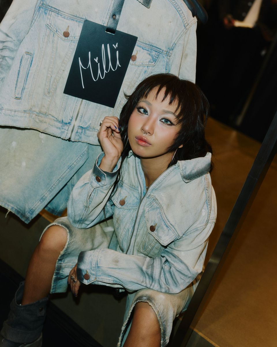 มิลลิ - ดนุภา คณาธีรกุล สะท้อนสไตล์แร็ปเปอร์สุดเท่ออกแบบมาเป็นแจ็คเก็ตเดนิม และกางเกงยีนส์ขาสั้นทรงจอร์ทส์ (Jorts) ที่เน้นเทคนิค Washed & Distressed Effect เล่นกับเฉดสีฟอกซีดอ่อน สเปรย์เพ้นต์ตามขอบปก ขอบเอว และปลายแขนเสื้อ เสริมด้วยเทคนิคสลัดสีและ 3D Crinkle ถ่ายทอดความดิบ เท่ สตรีท และ Self-Expression แบบ Unisex ได้อย่างชัดเจน
