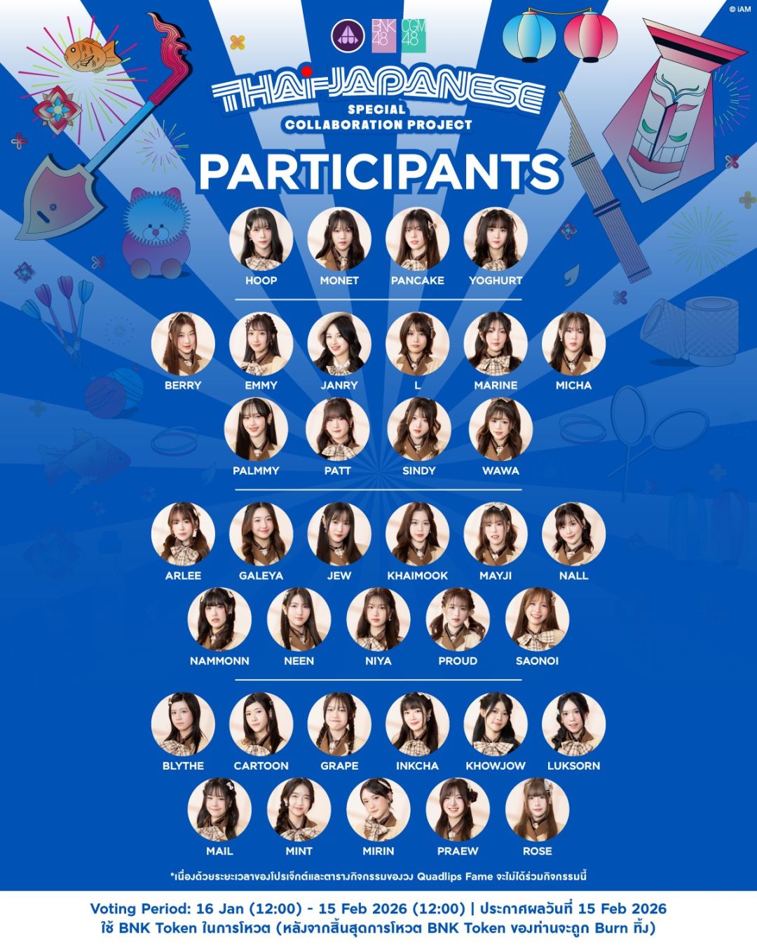 กลิ่นความอายความสนุกลอยมาแล้ว โดย“ป๊อปเป้อ-พิณญาดา จึงกาญจนา" ชิไฮนิน (ผู้จัดการวง BNK48) จากค่าย iAM อัพเดทความเคลื่อนไหวของกิจกรรม Thai-Japanese Special Collaboration Project โปรเจกต์คอลแลปครั้งใหญ่ระหว่างไทยกับญี่ปุ่น BNK48 x ลำไย ไหทองคำ x Tatuya Ishii (ทัตสึยะ อิชิอิ) ล่าสุดได้ปล่อยชื่อเพลง พร้อมสปอยล์คลิปดนตรี 30 วินาที ให้ได้โจ๊ะกันแบบเรียกน้ำย่อยทาง https://www.youtube.com/watch?v=2v9-QtYsth4 ซึ่งเป็นเพลง Kimi ga Iru Dake de (2026 Thai-Japanese Version) เพลงในตำนานของญี่ปุ่นที่จะหยิบมาทำเวอร์ชั่นใหม่ในครั้งนี้ โปรดิวซ์โดย กอล์ฟ F.HERO และเปิดโอกาสให้แฟนๆ ร่วมโหวตไอดอลในดวงใจ BNK48 & CGM48 โดยผู้ที่มีคะแนนสูงสุด 8 คนเท่านั้นจะมาร่วมทำโปรเจกต์นี้ด้วยกัน