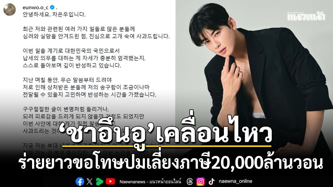 ตลอดระยะเวลา 11 ปีที่ผ่านมา ผมซึ่งมีข้อบกพร่องมากกว่าสิ่งที่ทำได้ดี กลับสามารถมายืนอยู่ในจุดที่เกินตัวอย่างชื่อ ชาอึนอู นี้ได้ ก็เพราะความรักและแรงเชียร์ที่ทุกท่านมอบให้อย่างไม่มีเงื่อนไข ด้วยเหตุนี้ ผมจึงรู้สึกผิดจนหาคำบรรยายไม่ได้ ที่แทนที่จะตอบแทนความเชื่อใจ กลับกลายเป็นการสร้างบาดแผลใหญ่และความเหนื่อยหน่ายใจให้กับแฟนๆ ที่เชื่อมั่นและสนับสนุนผม รวมถึงผู้ร่วมงานทุกคนครับ