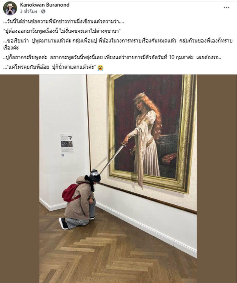 ล่าสุด ปู กนกวรรณ ได้โพสต์ผ่านเฟซบุ๊กส่วนตัว ระบุว่า "…วันนี้ได้อ่านข้อความพี่นักข่าวท่านนึงเขียนแล้วความว่า…. ปูต้องออกมารีบพูดเรื่องนี้ ไม่งั้นคนจะเดาไปต่างๆนานา…ขอเรียนว่า ปูพูดมานานแล้วค่ะ กลุ่มเพื่อนปู พี่น้องในวงการทราบเรื่องกันหมดแล้ว กลุ่มก๊วนของพี่เองก็ทราบเรื่องค่ะ ..ปูก็อยากจะรีบพูดค่ะ อยากจะพูดวันนี้พรุ่งนี้เลย เพียงแต่ว่ารายการมีคิวอัดวันที่ 10 กุมภาค่ะ เลยต้องรอ.. …“แค่โทรคุยกับพี่อ้อย ปูก็น้ำตาแตกแล้วค่ะ"