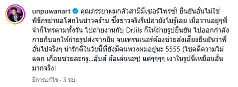 พร้อมระบุแคปชั่นว่า "คุณภรรยาผมกลัวสามีมีเซอร์ไพรซ์! ยืนยันอั๋นไม่ใช่พิธีกรย่านอโศกในข่าวคร้าบ ซึ่งข่าวจริงรึเปล่ายังไม่รู้เลย เมื่อวานอยู่ๆพี่จ๋าก็โทรตามทั้งวัน ไปถ่ายงานกับ DrJils ก็ให้ถ่ายรูปยืนยัน ไปออกกำลังกายก็บอกให้ถ่ายรูปส่งจากยิม จนเทรนเนอร์ต้องช่วยส่งเสียงยืนยันว่าพี่อั๋นไปจริง ๆ น่ารักดีในวัยนี้ที่ยังมีคนหวงผมอยู่นะ 5555 (โชคดีความไม่แตก เกือบซวยละกรู…อุ๊บส์ ล้อเล่นนะๆ) แต่ๆๆๆๆ เงาในรูปนี่เหมือนอั๋นมากจริง!"