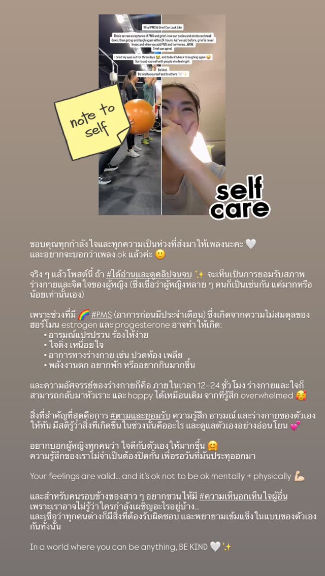 จริง ๆ แล้วโพสต์นี้ ถ้าได้อ่านและดูคลิปจบ จะเห็นเป็นการยอมรับสภาพร่างกายและจิตใจของผู้หญิง (ซึ่งเชื่อว่าผู้หญิงหลาย ๆ คนที่เป็นแบบนี้ แต่ภาพหรือน้อยคนจะแชร์)
