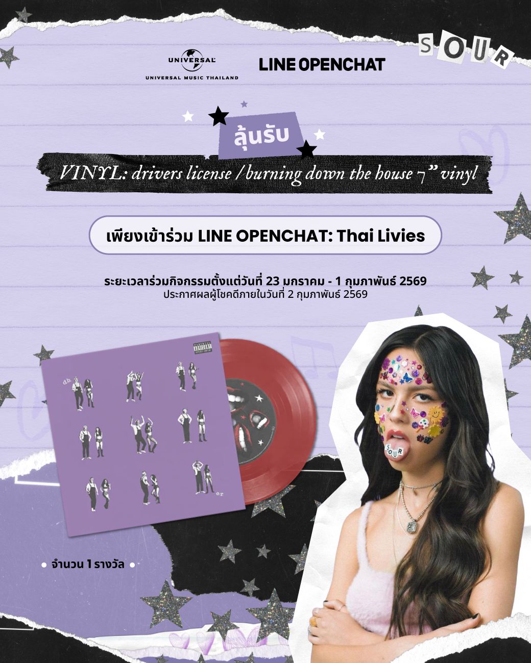 Thai Livies แฟนคลับชาวไทยของ Olivia Rodrigo สาวน้อยมหัศจรรย์แห่งวงการเพลงป็อปขวัญใจวัยรุ่น ได้เวลากลับมาครึกครื้นกันอีกครั้ง! ร่วมฉลองครบรอบ 5 ปีอัลบั้ม SOUR ที่ครองใจแฟน ๆ ทั่วโลกด้วยเพลงดังอย่าง “drivers license”, “deja vu”, “good 4 u”, “traitor” และอีกมากมาย ด้วยกิจกรรมสุด Exclusive จาก Universal Music Thailand ร่วมกับ LINE OpenChat เพียงแค่เข้าร่วม LINE OpenChat แล้วทำตามกติกา ลุ้นรับไปเลยแผ่นเสียง drivers license / burning down the house 7" vinyl จำนวน 1 รางวัล