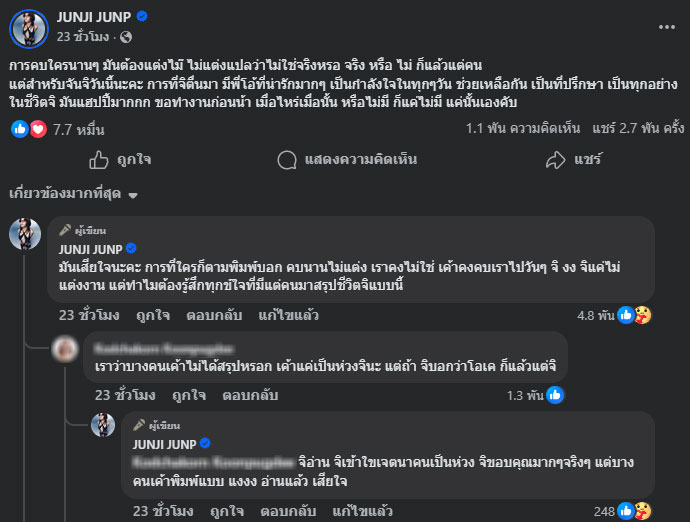 นอกจากนี้ สาวจันจิยังได้คอมเมนต์เพิ่มเติมว่า “มันเสียใจนะคะ การที่ใครก็ตามพิมพ์บอก คบนานไม่แต่ง เราคงไม่ใช่ เค้าคงคบเราไปวันๆ จิ งง จิแค่ไม่แต่งงาน แต่ทำไมต้องรู้สึกทุกข์ใจที่มีแต่คนมาสรุปชีวิตจิแบบนี้”