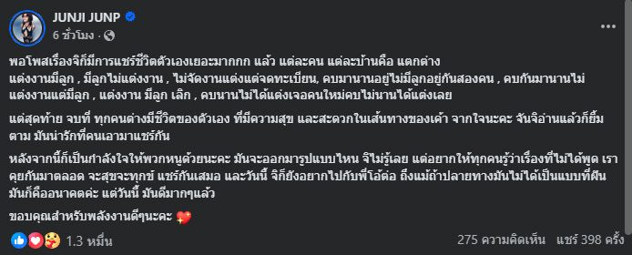 และต่อมา จันจิก็ได้โพสต์ข้อความอีกว่า "พอโพสเรื่องจิก็มีการแชร์ชีวิตตัวเองเยอะมากกก แล้ว แต่ละคน แต่ละบ้านคือ แตกต่าง แต่งงานมีลูก , มีลูกไม่แต่งงาน , ไม่จัดงานแต่งแต่จดทะเบียน, คบมานานอยู่ไม่มีลูกอยู่กันสองคน , คบกันมานานไม่แต่งงานแต่มีลูก , แต่งงาน มีลูก เลิก , คบนานไม่ได้แต่งเจอคนใหม่คบไม่นานได้แต่งเลย