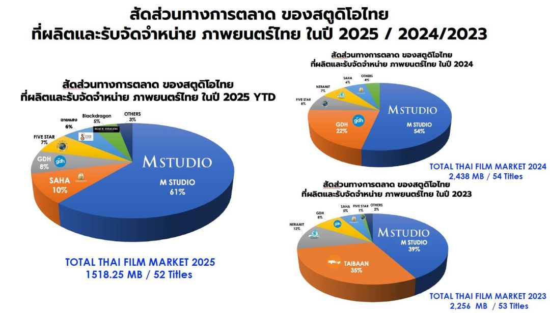 ในปี 2568 อุตสาหกรรมภาพยนตร์ไทยมีมูลค่ารวมประมาณ 1,518.25 ล้านบาท โดยรายได้ของ M STUDIO ที่รวมหนังไทยที่สตูดิโอรับจัดจําหน่ายรวมประมาณ 930.9 ล้านบาท ซึ่งครองสัดส่วนรายได้เป็น 61% ของตลาดรวม สะท้อนความเชื่อมั่นของผู้ชมที่มีต่อคอนเทนต์ไทยอย่างมีนัยสำคัญ ตอกย้ำสถานะผู้นำตลาดผ่านผลงานเชิงตัวเลข โดยก้าวขึ้นเป็น สตูดิโอผู้ผลิตและจัดจำหน่ายภาพยนตร์ไทยอันดับ 1 ติดต่อกัน 3 ปีซ้อน มีภาพยนตร์หลายเรื่องทำรายได้ตั้งแต่ 100 ล้านบาท ไปจนถึงมากกว่า 800 ล้านบาท จากหลายโปรเจกต์สำคัญ อย่างไรก็ตาม M STUDIO มองว่า ความสำเร็จในอดีตไม่เพียงพอสำหรับการแข่งขันในระยะยาว “วันนี้หนังไทยไม่ได้แข่งกันแค่จำนวนเรื่อง แต่แข่งกันที่ ‘คุณค่าของคอนเทนต์’ และความสามารถในการต่อยอดในระยะยาว”