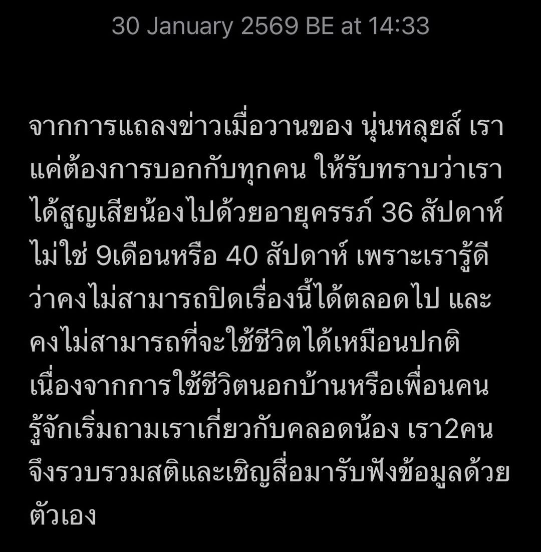 สิ่งที่เกิดขึ้นมันบอบช้ำกันหมด เพราะความสัมพันธ์ของพวกเรา คือคนใน “ครอบครัว”ไม่ใช่แค่หมอกับคนไข้ทั่วไป” ตั้งแต่วันที่ 10 จนถึงวันแถลงข่าว ทุกคนโทรหากันและร้องไห้ด้วยกันทุกวัน นุ่นในฐานะแม่และหลุยส์ในฐานะคนเป็นพ่อ ก็ดูแลนุ่นและลูกอย่างดีที่สุดแล้ว ส่วนน้องหมอก็ทําดีที่สุดแล้วเช่นกัน หยุดโทษหมอหรือตั้งคําถามกับเราเถอะค่ะ ขอพื้นที่ให้เราได้หายใจและก้าวต่อไปเถอะนะคะ