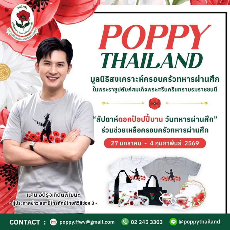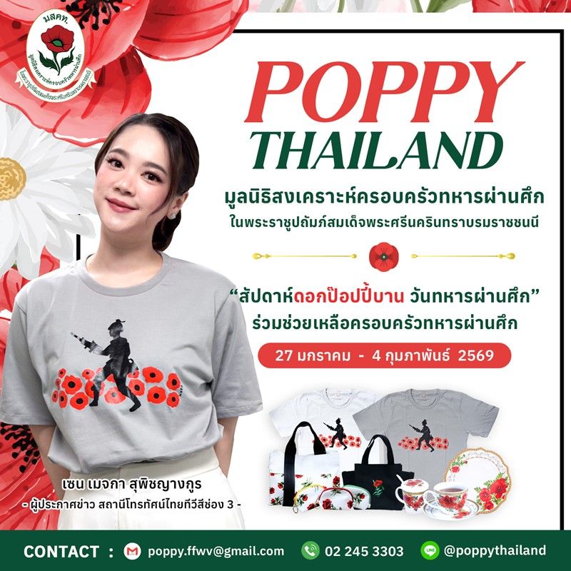 โดยได้ผู้ประกาศข่าวรายการเที่ยงวันทันเหตุการณ์อย่าง ดร.หมวย อริสรา กำธรเจริญ รวมตัวนักแสดง ลีน่า ลลินา ชูเอ็ทท์ - เซ้นต์ ศุภพงษ์ อุดมแก้วกาญจนา พร้อม 2 ผู้ประกาศ แคน อติรุจ กิตติพัฒนะ - เซน เมจกา สุพิชญางกูร นัดสวมเสื้อ หนึ่งในผลิตภัณฑ์จากมูลนิธิสงเคราะห์ครอบครัวทหารผ่านศึก ในพระราชูปถัมภ์สมเด็จพระศรีนครินทราบรมราชชนนี เดินหน้าส่งต่อเรื่องดีๆ ชวนร่วมเลือกซื้อดอกป๊อปปี้ ดอกไม้ที่ระลึกสัญลักษณ์วันทหารผ่านศึก พร้อมหลากหลายผลิตภัณฑ์ของมูลนิธิฯ เพื่อหารายได้ช่วง “สัปดาห์ดอกป๊อปปี้บานวันทหารผ่านศึก” โดยเริ่มตั้งแต่วันนี้ - 4 กุมภาพันธ์ 2569 ทั้งนี้ประชาชนทั่วไปสั่งซื้อดอกป๊อปปี้และ ผลิตภัณฑ์ได้ที่ มูลนิธิสงเคราะห์ครอบครัวทหารผ่านศึก ในพระราชูปถัมภ์สมเด็จพระศรีนครินทราบรมราชชนนี